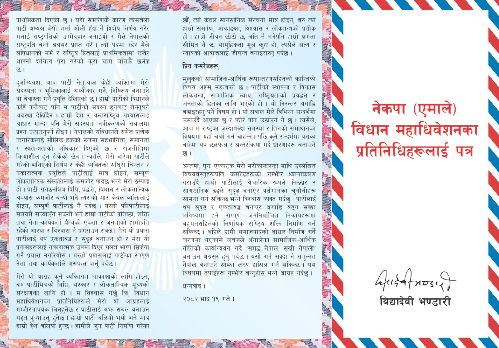 आज मेरो सदस्यतामाथि उठाइएको प्रश्न मेरा निम्ति गम्भीर रूपमा खडा भएको छ । यो पत्र मेरो आत्मरक्षाका लागि होइन, बरु यो हाम्रो पार्टीको उज्ज्वल भविष्यका लागि हो। त्यसैले, तपाईंहरूले यस पत्रलाई आफ्नो अधिकारको रक्षा, पार्टीको सबलता, सुदृढ एवम् दिगो एकताको रूपमा बुझ्नुहुनेछ भन्ने गहिरो विश्वास लिएको छ ।