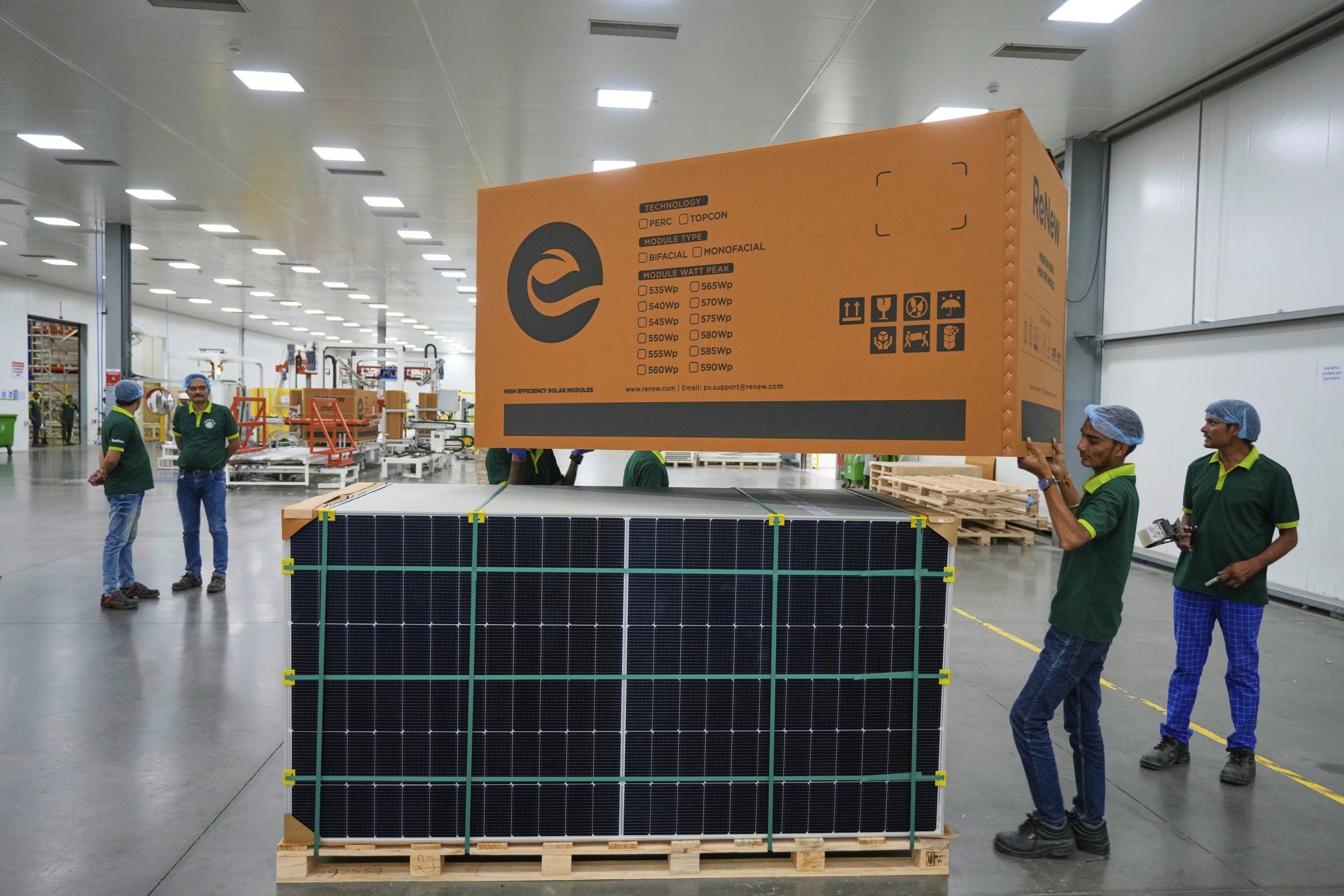 Workers pack solar panels at a ReNew manufacturing plant on the outskirts of Jaipur, India, Thursday, Aug. 21, 2025. (AP Photo/Manish Swarup)