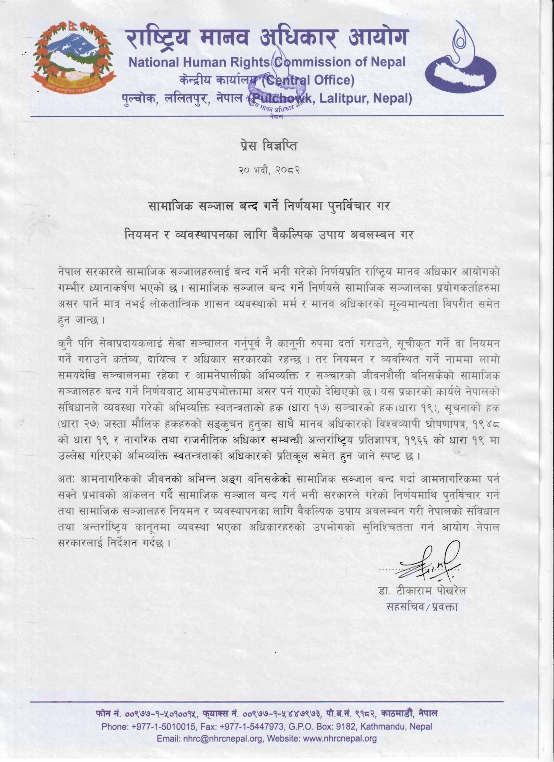 आयोगले शुक्रबार विज्ञप्ति जारी गर्दै सामाजिक सञ्जाल बन्द गर्ने निर्णयले सामाजिक सञ्जालका प्रयोगकर्तामा असर पार्ने मात्र नभई लोकतान्त्रिक शासन व्यवस्थाको मर्म र मानव अधिकारको मूल्यमान्यता विपरीत हुने बताएको छ ।