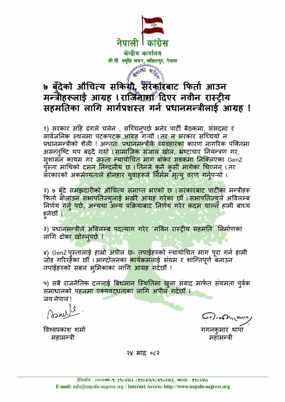 उनीहरूले प्रधानमन्त्री केपी शर्मा ओलीलाई पदबाट राजीनामा दिन आग्रह गर्दै पार्टी सभापति देउवालाई सरकारमा सहभागी सबै मन्त्रीलाई फिर्ता बोलाउन आग्रह पनि गरेका छन् ।