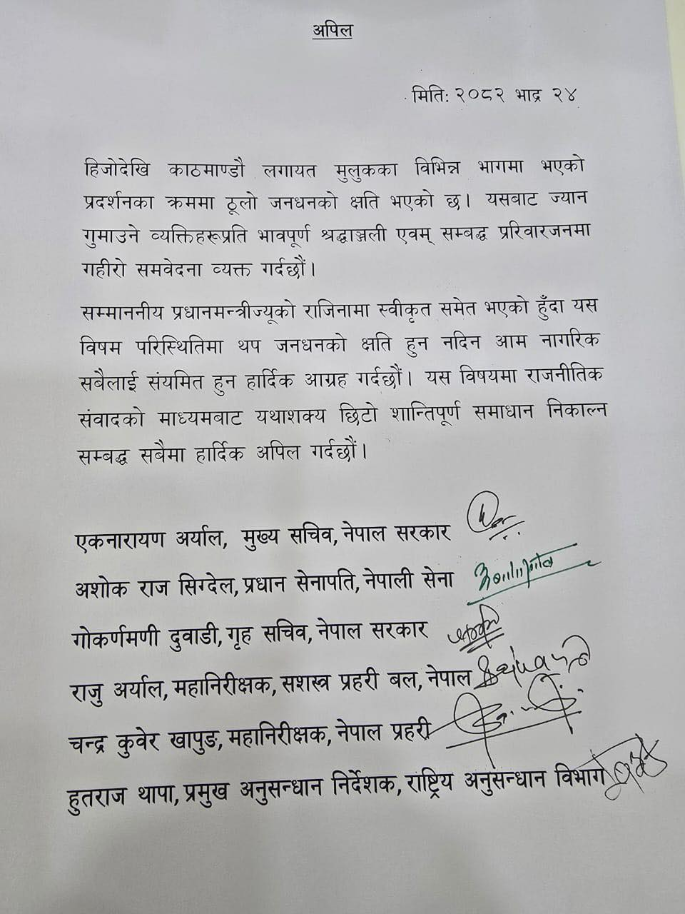 प्रधानमन्त्रीको राजीनामा आइसकेको अवस्थामा मुख्यसचिव एकनारायण अर्याल, प्रधान सेनापति अशोकराज सिग्देल, गृहसचिव गोकर्णमणी दुवाडि, एपीएफका आईजीपी राजु अर्याल, नेपाल प्रहरीका आईजीपी चन्द्रकुवेर खापुङ र राष्ट्रिय अनुसन्धान विभाग प्रमुख हुतराज थापाले एक विज्ञप्ती जारी गर्दै यस्तो अपिल गरेका हुन् ।