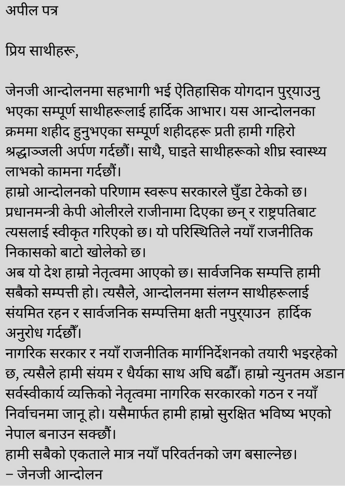 सार्वजनिक अपीलमा भनिएको छ, ‘अब यो देश हाम्रो नेतृत्वमा आएको छ, सार्वजनिक सम्पत्ति हामी सबैको सम्पत्ति हो । त्यसैले आन्दोलनमा संलग्न साथीहरुलाई संयमित रहन र सार्वजनिक सम्पत्तिमा क्षति नपुर्याउन हार्दिक अनुरोध गर्दछौं ।’