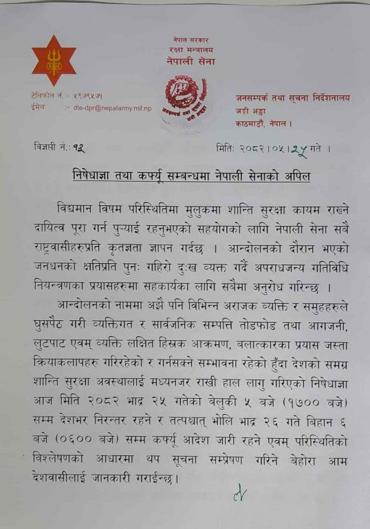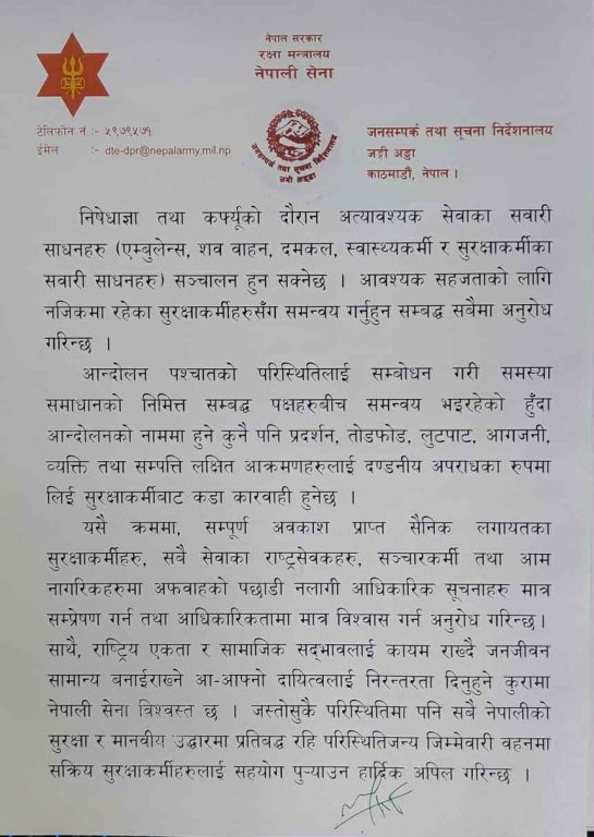 सेनाले विज्ञप्ति जारी गरी आज आज बेलुका ५ बजेसम्म देशभर निषेधाज्ञा निरन्तर रहने र त्यपछि भोलि बिहान ६ बजेसम्म कर्फ्यू आदेश जारी भएको जानकारी दिएको हो ।