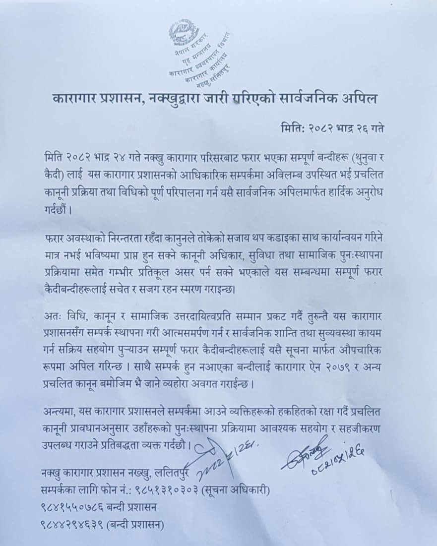 काठमाडौं । नख्खु कारागार प्रशासनले फरार सबै कैदी बन्दीलाई सम्पर्कमा आउन सुचना जारी गरेको छ । प्रशासले आज एक सुचना जारी गर्दे मिति २०८१ भदौ २४ गते कारागार परिसरबाट फरार भएका सम्पूर्ण बन्दीहरूलाई यस कारागार प्रशासनको आधिकारिक सम्पर्कमा अविलम्ब उपस्थित भई कानूनी प्रक्रिया तथा विधिको पूर्ण पालनाको अनुरोध गरेको छ ।