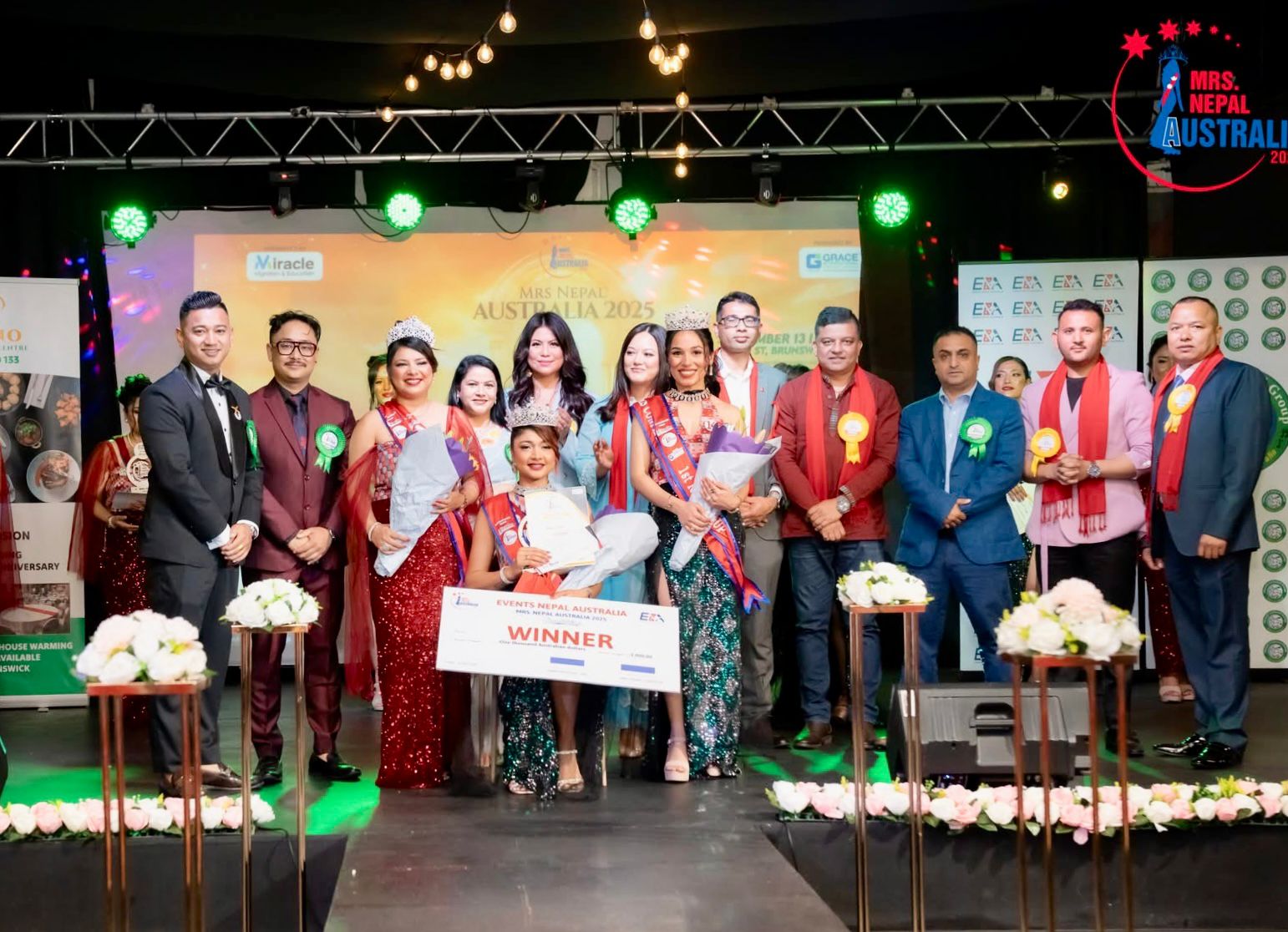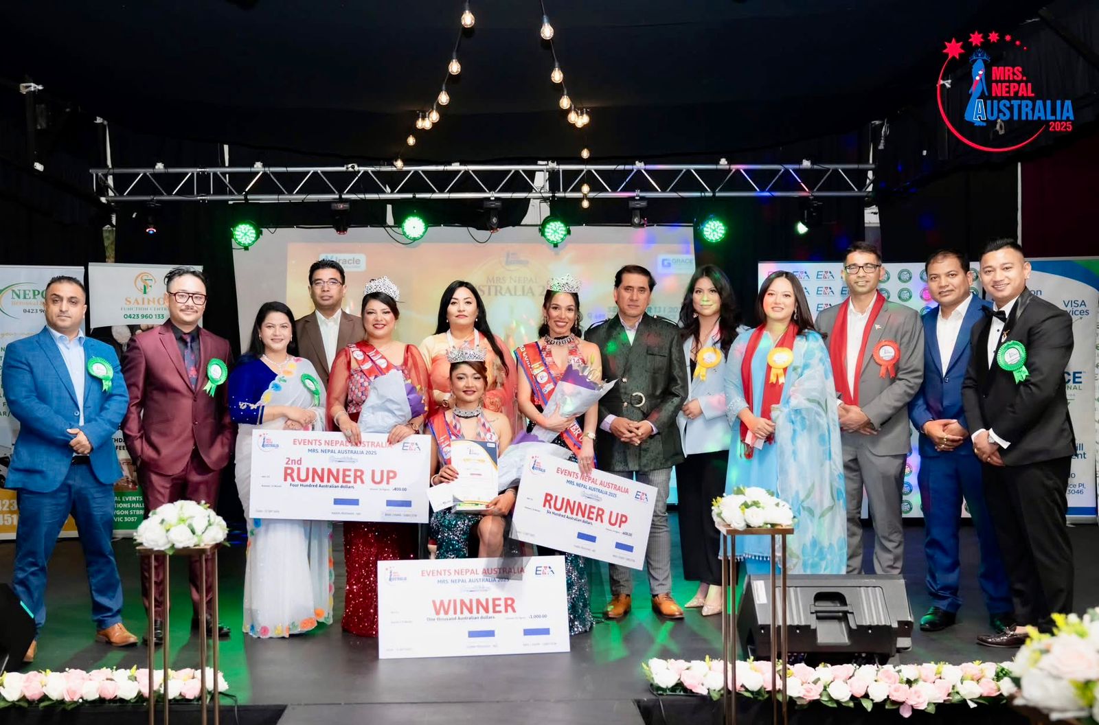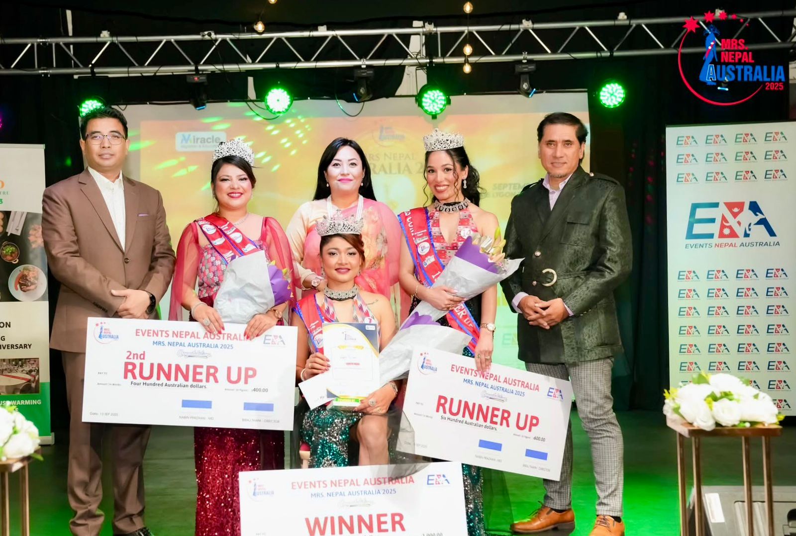 अष्ट्रेलिया: मिसेस नेपाल अष्ट्रेलिया २०२५ को भव्य फाइनल २०२५ सेप्टेम्बर १३ मा अष्ट्रेलियाको मेलबर्नमा भव्यता, शालीनता र सांस्कृतिक गौरवका साथ सम्पन्न भयो। प्रतिष्ठित ताज लिला तिवारी पौडेलले आफ्नो आत्मविश्वास, आकर्षण र प्रेरणादायी उपस्थितिबाट निर्णायक तथा दर्शकलाई प्रभावित गर्दै जितिन्। ताजसँगै उनले “एलीगेन्ट वाक” उपाधि, १,००० अष्ट्रेलियन डलरको नगद पुरस्कार, लेट मी इन कोरियन हस्पिटल नेपालबाट ५०,००० रुपैयाँ बराबरको गिफ्ट ह्याम्पर तथा विभिन्न अन्य उपहारहरू प्राप्त गरिन्।