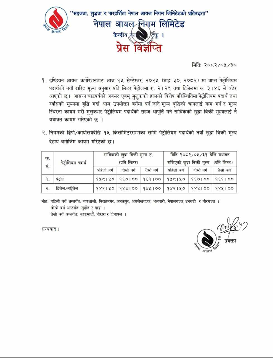 आईओसीबाट ३० भदौमा प्राप्त पेट्रोलियम पदार्थको नयाँ खरिद मूल्य अनुसार प्रति लिटर २ रुपैयाँ २९ पैसा र डिजेलमा ३ रुपैयाँ ४६ पैसा बढेर आएको निगमले जनाएको छ ।