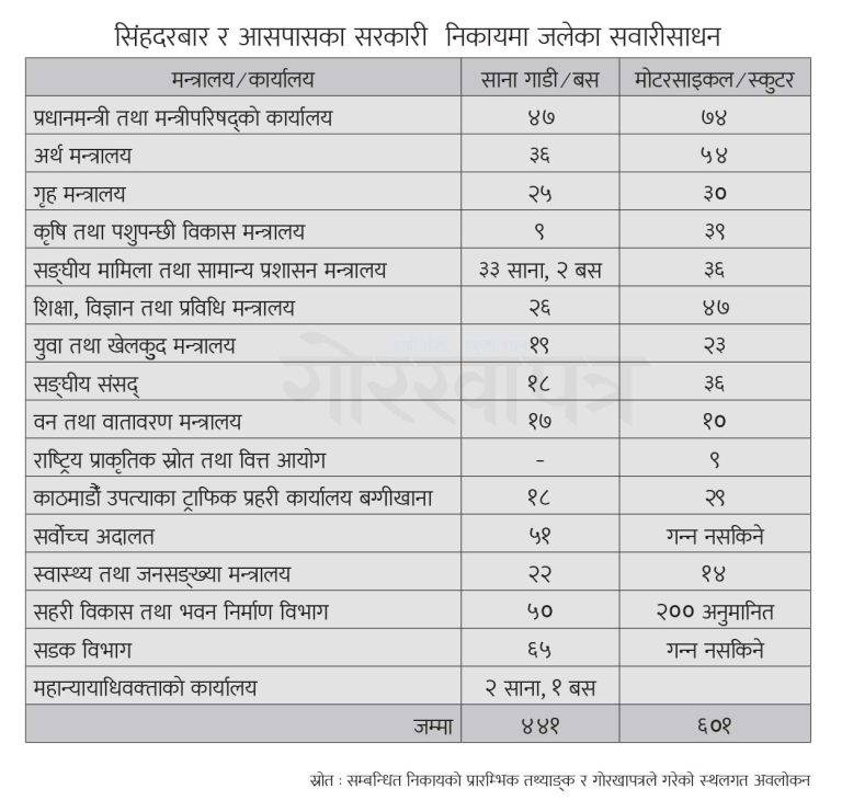 मुख्य प्रशासनिक केन्द्र सिंहदरबार र आसपासमा रहेका सरकारी निकायमा भएको आगजनीबाट एक हजारभन्दा बढी सवारीसाधन जलेर नष्ट भएका छन् । जेनजी समूहले गरेको आन्दोलनका क्रममा गत मङ्गलबार भएको आगजनीबाट ४४१ वटा चारपाङ्ग्रे तथा ६०१ वटा दुईपाङ्ग्रे गरी एक हजार ४२ वटा सवारीसाधन नष्ट भएका हुन् ।