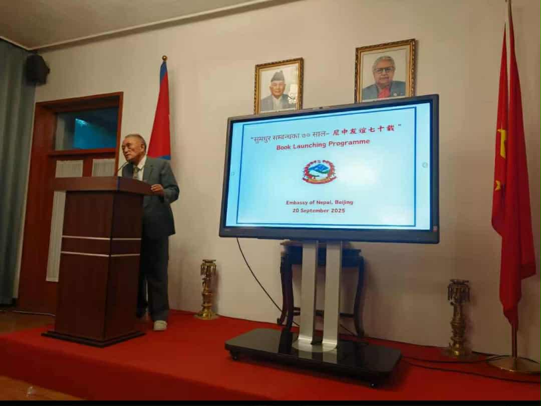 आज बेइजिङस्थित नेपाली दूतावासको सभाकक्षमा विमोचन गरिएको उक्त पुस्तक नेपाल र चीनबीचको सम्बन्धमा लिखित दस्ताबेज रहेको मञ्चका अध्यक्ष किशोर श्रेष्ठले जानकारी दिनुभयो ।
