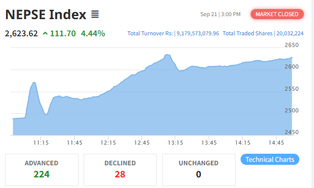 आज ३२९ कम्पनीको दुई करोड ३२ हजार २२४ कित्ता शेयर एक लाख आठ हजार ९०८ पटक खरिदबिक्री हुँदा रू नौ अर्ब १७ करोड ९५ लाख ७३ हजार बराबरको कारोबार भएको छ । आज म्युचुअल फण्ड शून्य दशमलव ७१ र निर्जीवन बिमा चार दशमलव शून्य दुई प्रतिशतले घटेको छ भने अरु सबै समूहको उपसूचक बढेको छ ।