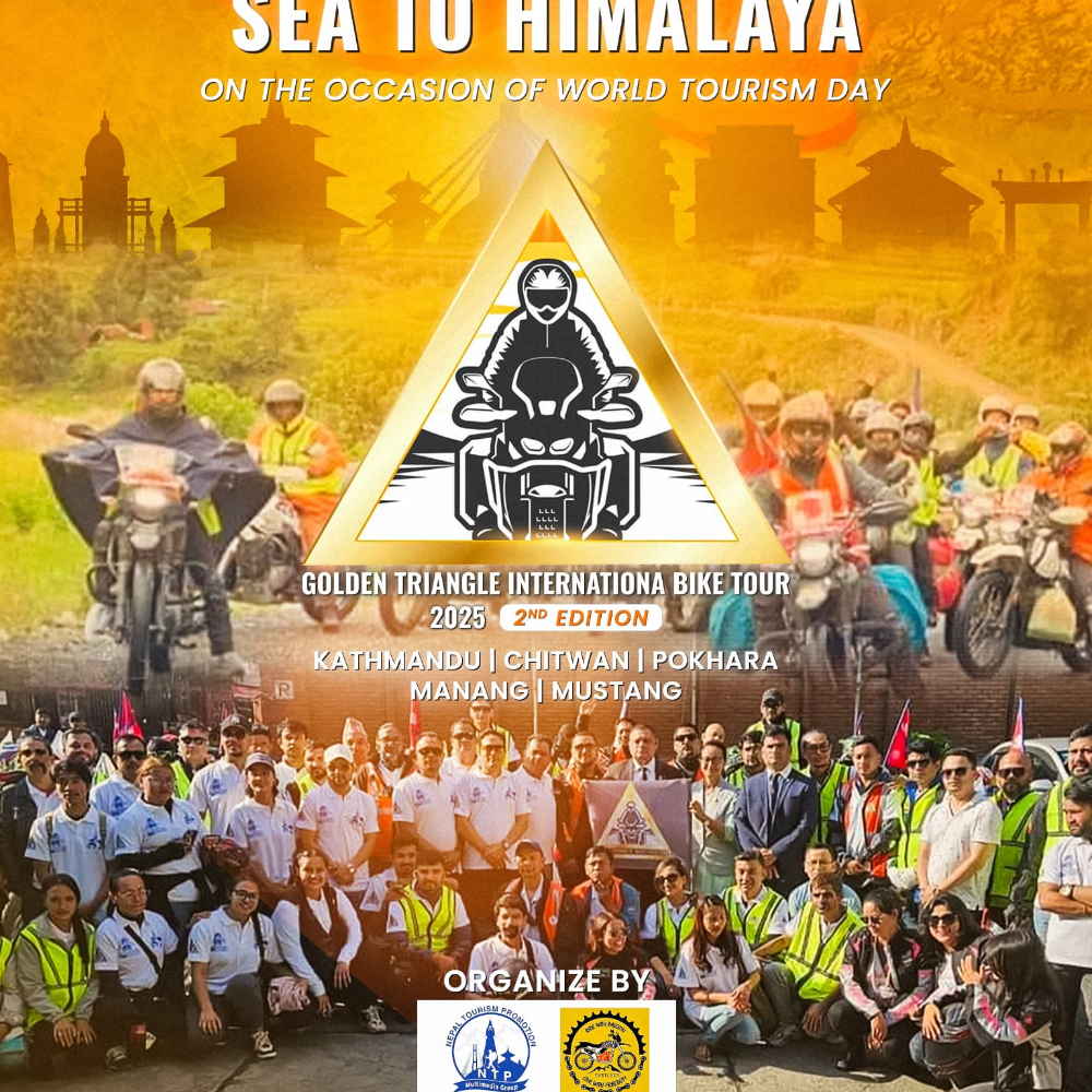 दुई पाङ्ग्रे मोटरसाइकलमार्फत नेपालका पर्यटकीय गन्तव्यको भ्रमण गर्ने युवाहरुलाई प्रोत्साहन तथा उत्कृष्ट पर्यटकीय गन्तव्यहरुको प्रवर्द्धन गर्ने लक्ष्य र उद्धेश्यका साथ नेपाल पर्यटन बोर्डको समन्वयमा एनटीपी मल्टिमिडिया ग्रुपले ‘गोल्डेन ट्रयाङ्गल इन्टरनेश्ननल बाइक टूर’ कार्यक्रमको स्थापना गरेको हो । यसपटक बंगलादेश र भारतका राइडर आउने भएपछि उत्साह थपिएको एनटीपी मल्टिमिडिया ग्रुपका अध्यक्ष तथा टूरका संस्थापक विष्णु विवेकले बताए ।