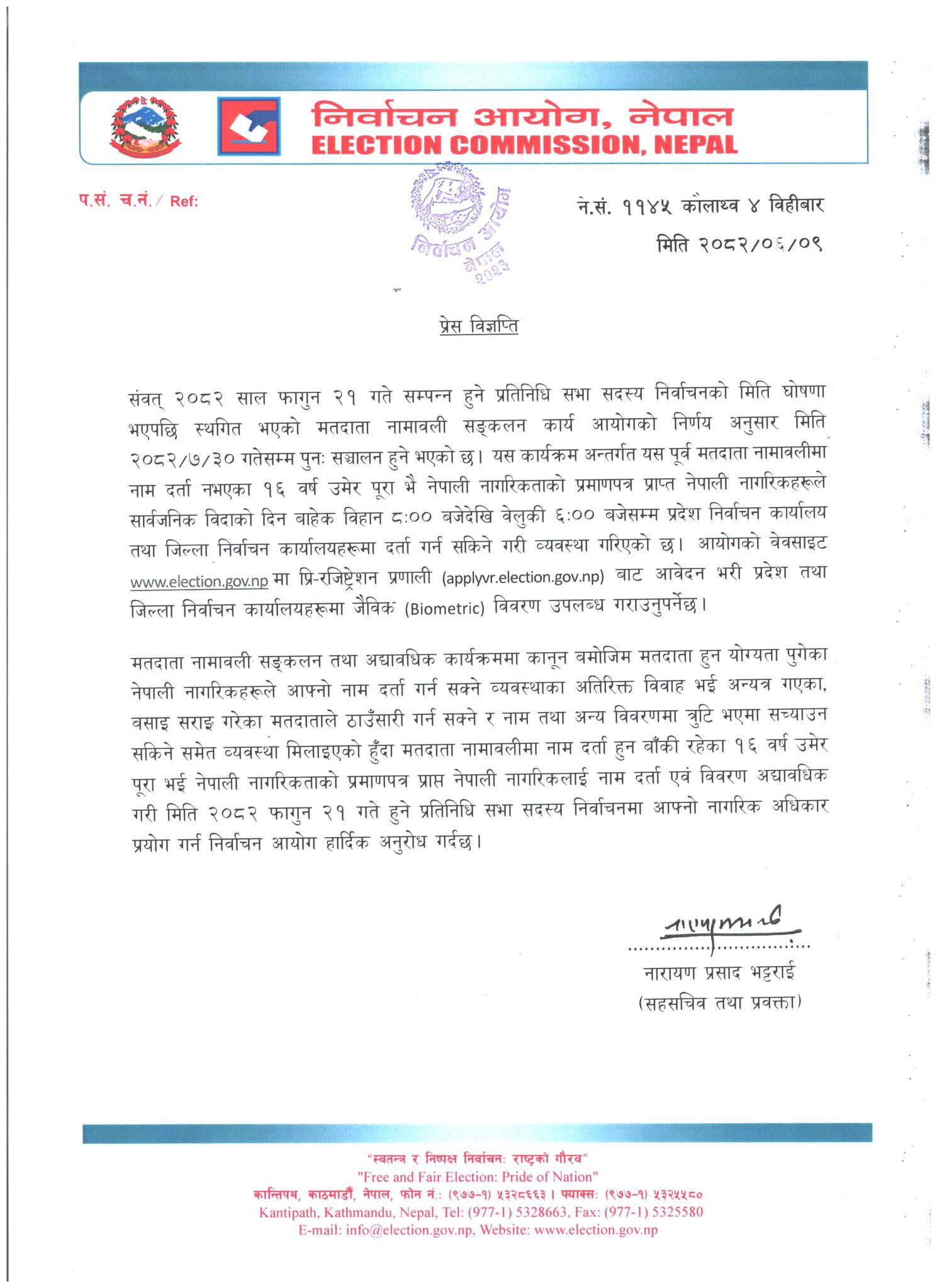 प्रावधानअनुसार निर्वाचन मिति घोषणा भएसँगै मतदाता नामावली संकलन कार्य स्वतः बन्द हुने भए पनि नयाँ पुस्ता मताधिकारबाट वञ्चित नहोस् भन्ने उद्देश्यले सरकारले विशेष अध्यादेशमार्फत प्रक्रिया खुला गरेको आयोगले जनाएको छ ।