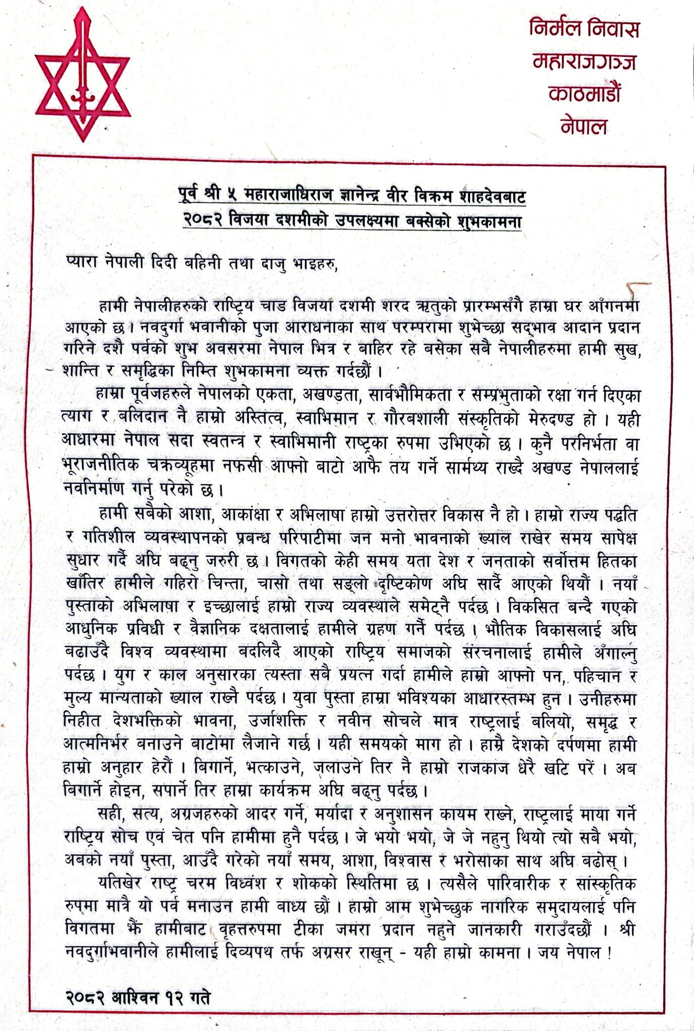 २०८२ विजय दशमीको अवसरमा एक शुभकामना सन्देश दिदै पूर्वराजा शाहले आउँदो पुस्ताको लागि नयाँ समय, आशा, विश्वासका साथ अघि बढाउने जिम्मेवारी पुरा गर्ने सबैको साझा कर्तव्य भएको पनि जनाउनु भएको छ ।