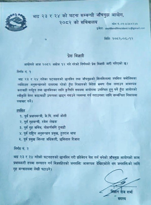 त्यही दिन जारी अर्को सूचनामा जाँचबुझ आयोग ऐ २०२६ को दफा ३ बमोजिम सोही दिनदेखि कार्य प्रारम्भ गरेको भन्दै उक्त आयोगको कार्यक्षेत्रभित्र पर्ने विषयमा सरकारका नियमित संयन्त्रबाट तत्काल कारवाही अगाडि नबढाउन भनिएको थियो ।