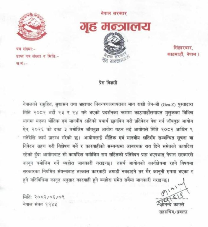 सरकारले भदौ २३ र २४ को प्रदर्शन क्रममा भएका भौतिक तथा मानवीय क्षतिको छानबिन गरी प्रतिवेदन पेस गर्न पूर्वन्यायाधीश गौरीबहादुर कार्कीको अध्यक्षतामा जाँचबुझ आयोग गठन गरेको छ । आयोगलाई क्षति विश्लेषण गरी कारबाहीको राय दिने कार्यादेश छ । त्यसै सन्दर्भमा गृहले उक्त विज्ञप्ति जारी गरेको हो । तर अपराधमा संलग्न देखिएकाहरुलाई रिहा गर्न त्यसले गलत सन्देश जाने छ । किनकी अपराधमा संलग्नलाई कारबाही गर्न अहिले कानुनले रोक्दैन । राजनीतिक बाहेकका विषयमा तत्कार कानुनअनुसार कारबाही नगर्ने हो भने देशको विधि, पद्धितिमा त प्रश्न उठ्छ नै सरकारमाथि नै गम्भीर आरोप लाग्न सक्छ ।