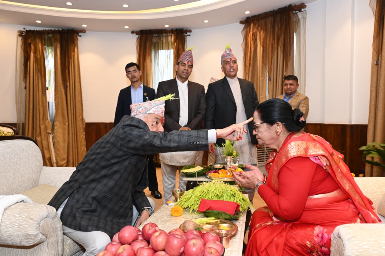 उहाँले हनुमान ढोका दरवारका गुरु देवराज अर्यालतथा राष्ट्रपतिका पुरोहित अर्जुनप्रसाद न्यौपानेबाट टिका र जमरा ग्रहण गर्नुभएको हो ।