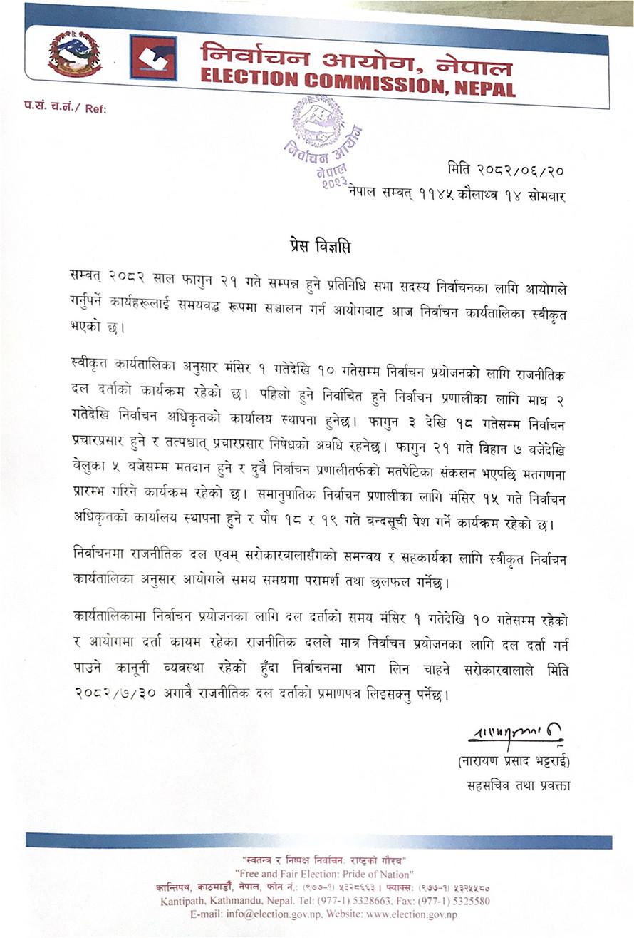स्वीकृत कार्यतालिकाअनुसार आगामी मङ्सिर १ गतेदेखि १० गतेसम्म निर्वाचन प्रयोजनको लागि राजनीतिक दल दर्ताको कार्यक्रम तय गरिएको आयोगले जनाएको छ ।