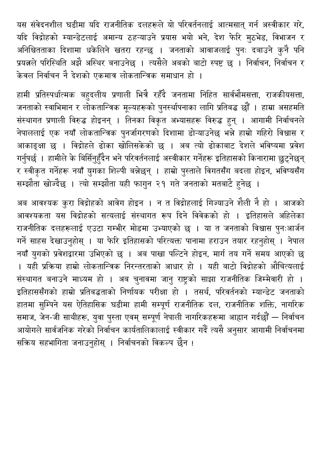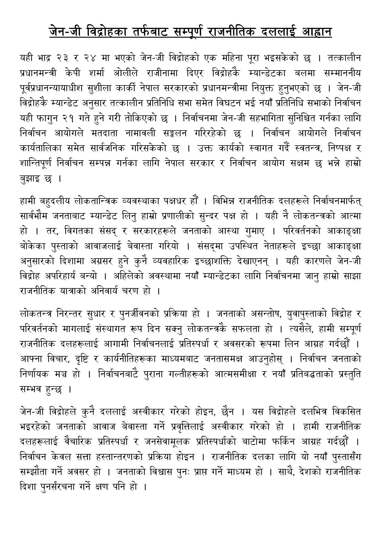 जेनजी समूहले परिवर्तनको म्यान्डेट जनताको हातमा सुम्पिने ऐतिहासिक घडीमा सम्पूर्ण राजनीतिक दल, राजनीतिक शक्ति, नागरिक समाज, जेनजी, युवा पुस्ता तथा सम्पूर्ण नेपाली नागरिकहरूमा निर्वाचनमा सक्रिय रूपमा लाग्न अपिल गरेको छ ।