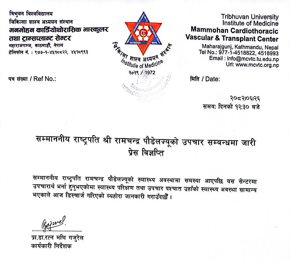 राष्ट्रपति पौडेलको स्वास्थ्य परीक्षणपछि चिकित्सकले सामान्य सुधार भएको बताउँदै आइतबार बिहान डिस्चार्ज गरेका हुन् । अस्पताल स्रोतका अनुसार हाल उहाँको स्वास्थ्य अवस्था स्थिर छ ।