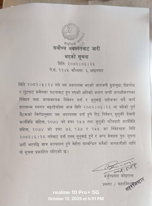 यसअघि गत भदौ २४ गते भएको ‘जेनजी’ प्रदर्शनका क्रममा अदालतमा आगजनी, ढुङ्गामुढा, तोडफोड र लुटपाटबाट क्षति हुँदा बन्दी प्रत्यक्षीकरणका निवेदन तथा अत्यावश्यक निवेदन दर्ता र सुनुवाइबाहेक सबै काम स्थगित गरिएको थियोे । त्यसयता सर्वोच्चले त्रिपालमा इजलास बसेर सेवा दिइरहेको छ ।