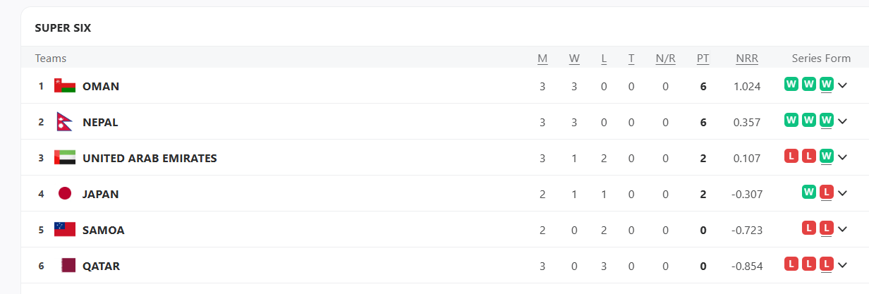 ओमानको अल अमिरतस्थित ओमान क्रिकेट एकेडेमी टर्फ–१ मा भएको खेलमा नेपालले कतारलाई पाँच रनले पराजित गर्दै सुपर सिक्समा लगातार दोस्रो जित दर्ता गराएको हो । जितसँगै नेपालले ६ अंक जोडेको छ ।
