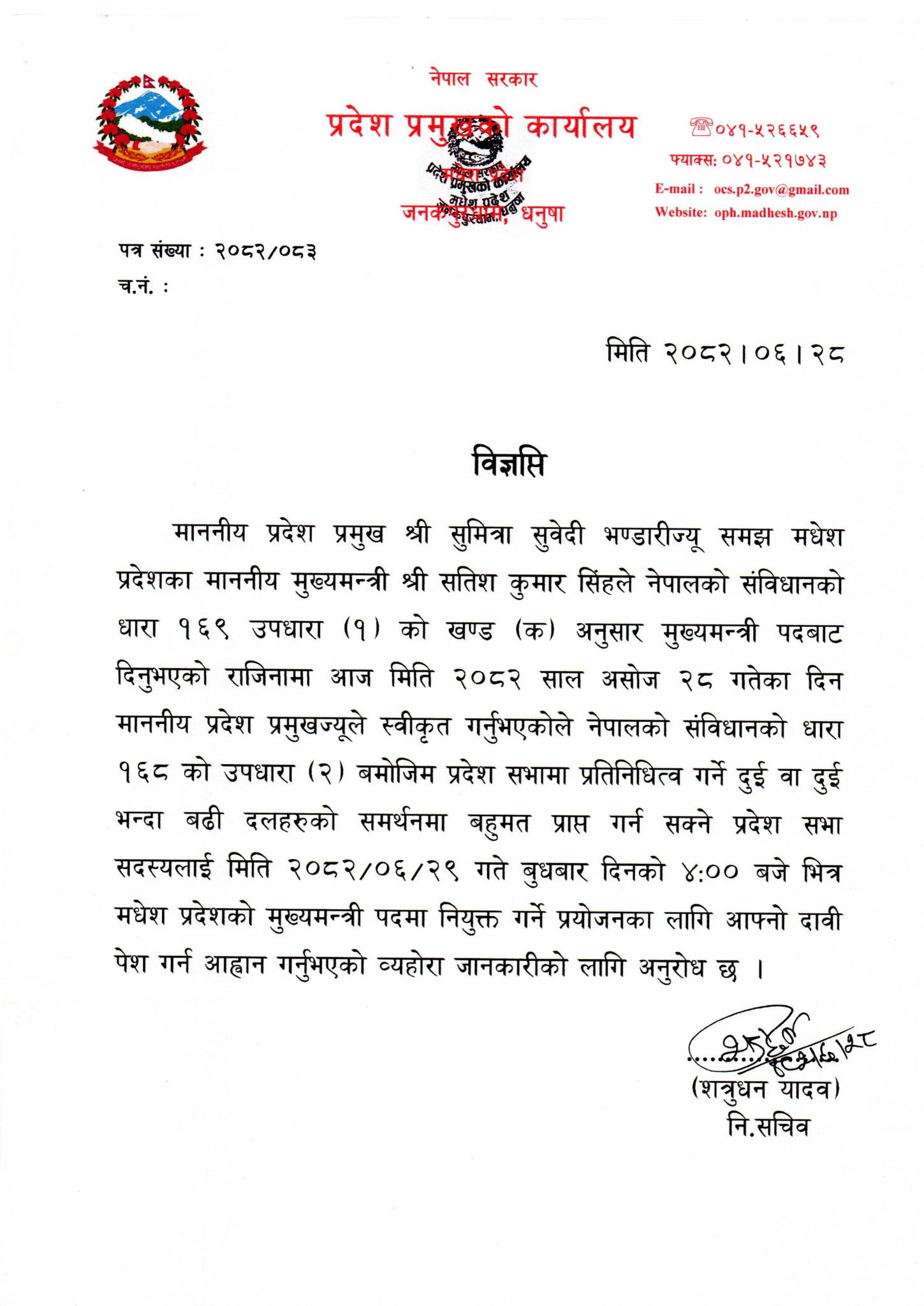 काठमाडौँ । मधेश प्रदेशमा नयाँ सरकार गठनका लागि आह्वान गरिएको छ ।