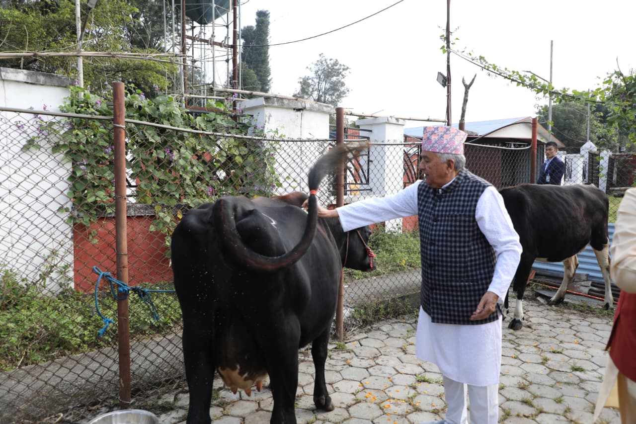 कात्तिक कृष्णऔँसी अर्थात् गाईतिहारका दिन देवी लक्ष्मीको प्रतीकस्वरूप गाईको पूजा गर्ने गरिन्छ। राष्ट्रपति पौडेलले शीतल निवासमा विधिपूर्वक गाईको पूजा गरी गाईलाई खानेकुरा खान दिनुभएको हो ।