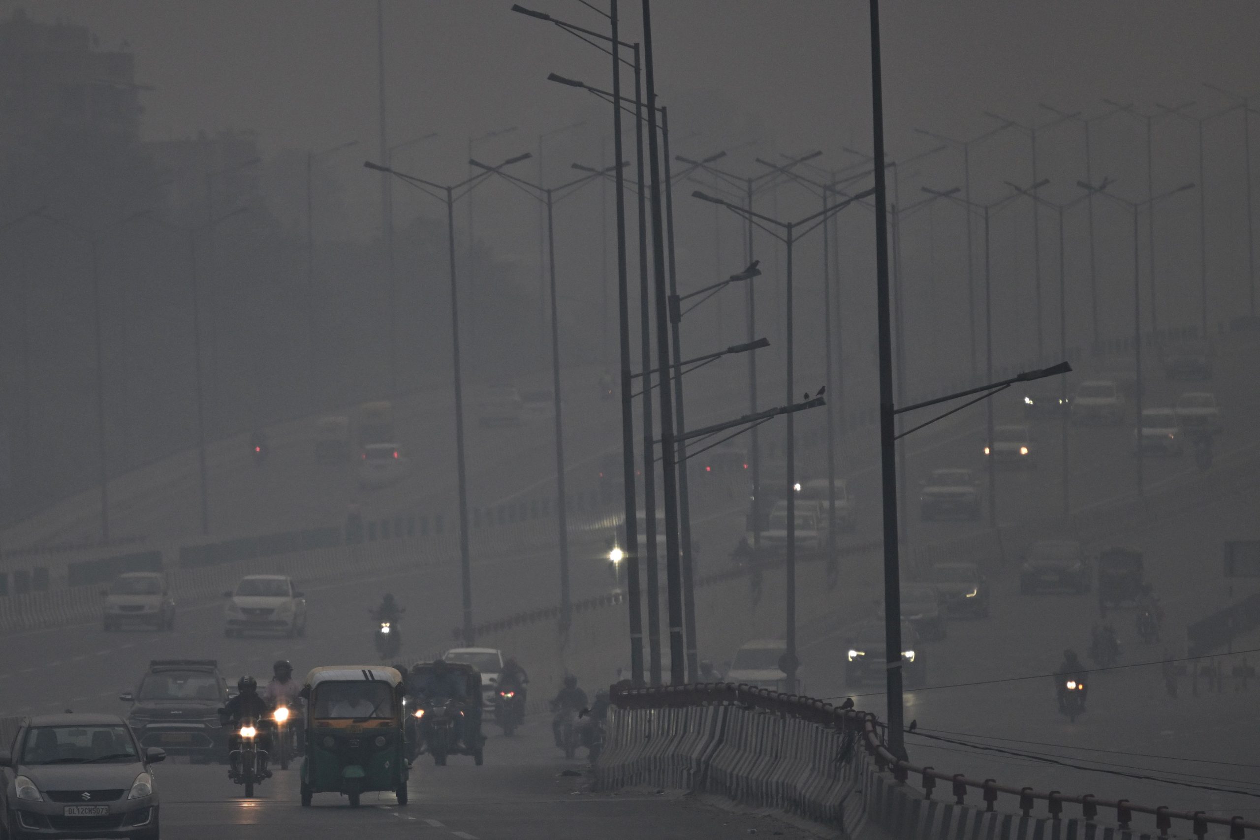Commuters drive amid heavy smog in New Delhi on October 21, 2025, as haze engulfed the city skyline a day after Diwali celebrations, the Hindu festival of lights. Toxic air in India’s capital spiralled to more than 23 times UN daily health limits on October 21, as the annual winter pollution blanketed the sprawling urban area of 30 million people. (Photo by Arun SANKAR / AFP)