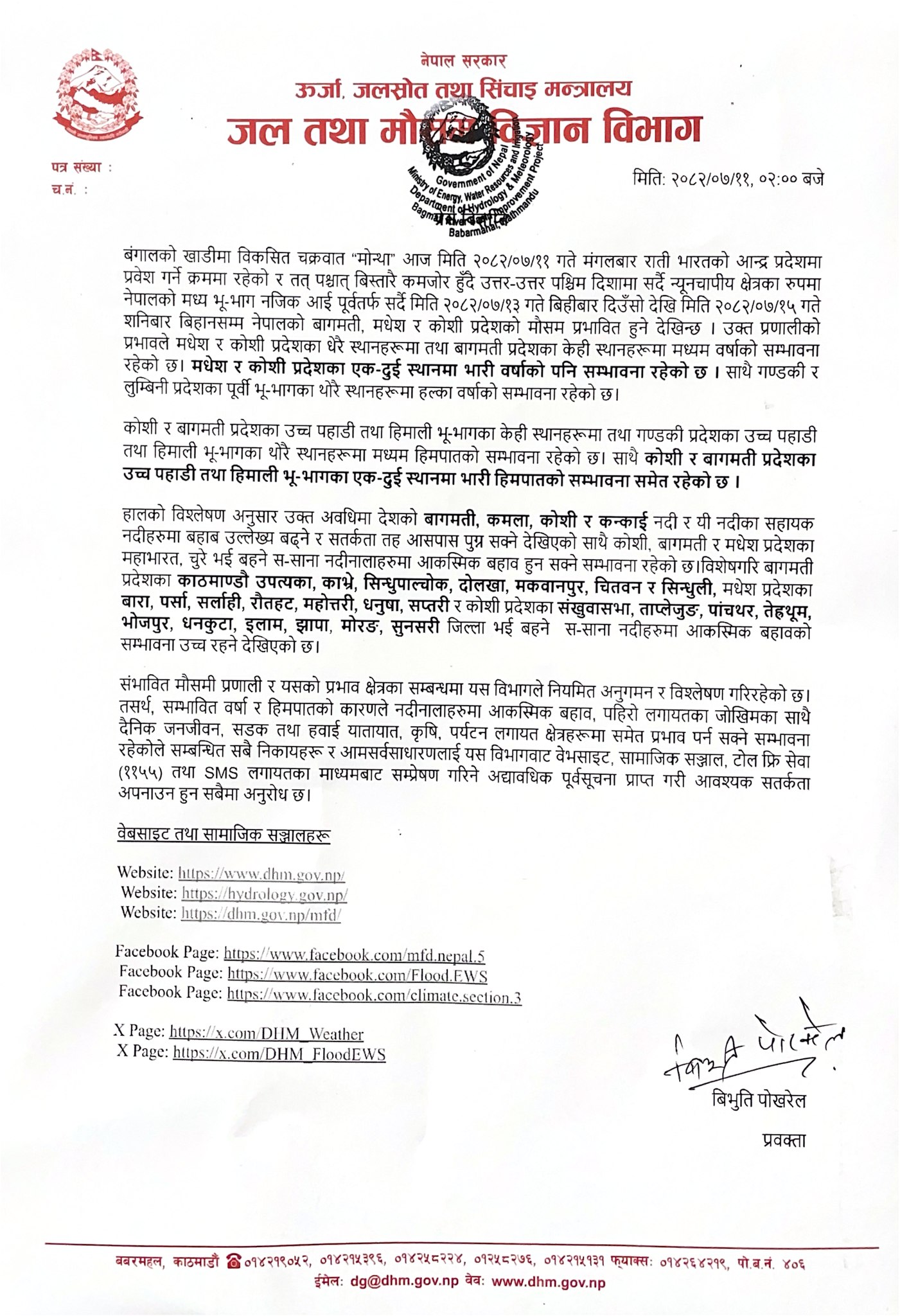 भारी वर्षाका कारण बागमती, कोशी, कमला र कन्काई नदी तथा तिनका सहायक नदीहरूमा बहाव बढ्ने, साथै स–साना नदीनालामा आकस्मिक बाढी आउन सक्ने चेतावनी दिइएको छ ।