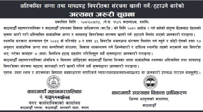 काठमाडौं महानगरपालिका क्षेत्रभित्र र सिमाना जोडिएका काठमाडौं जिल्ला भित्रका सार्वजनिक स्थानका अतिक्रमित तथा मापदण्ड विपरीतका संरचना नहटाए कारबाही गर्ने चेतावनी समेत दिइएको छ ।