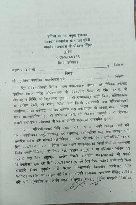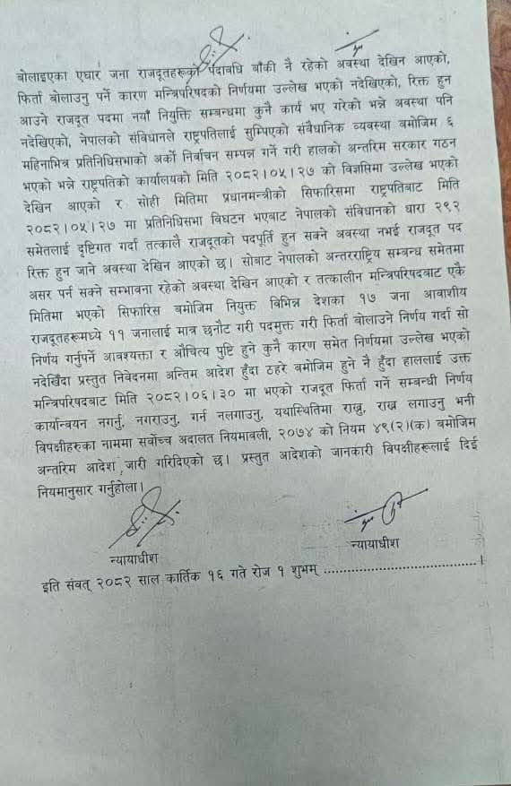 न्यायाधीशहरू शारंगा सुवेदी र श्रीकान्त पौडेलको इजलासले राजदूत फिर्ता गर्ने सरकारको निर्णय तत्काल कार्यान्वयन नगर्न आदेश दिएको हो ।