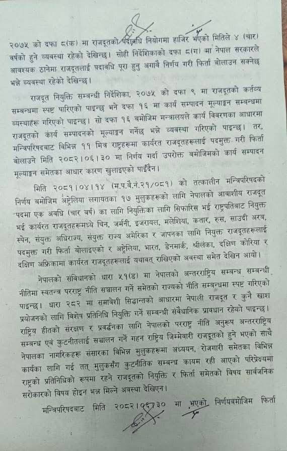 वर्तमान शुसिला कार्की सरकारले केही दिन अघि विभिन्न ११ देशका लागि नेपाली राजदूतहरुलाई हटाउने निर्णय गरेको थियो । यी राजदूतले सरकारको नीति विपरीत कार्य गरेको आरोप थियो ।