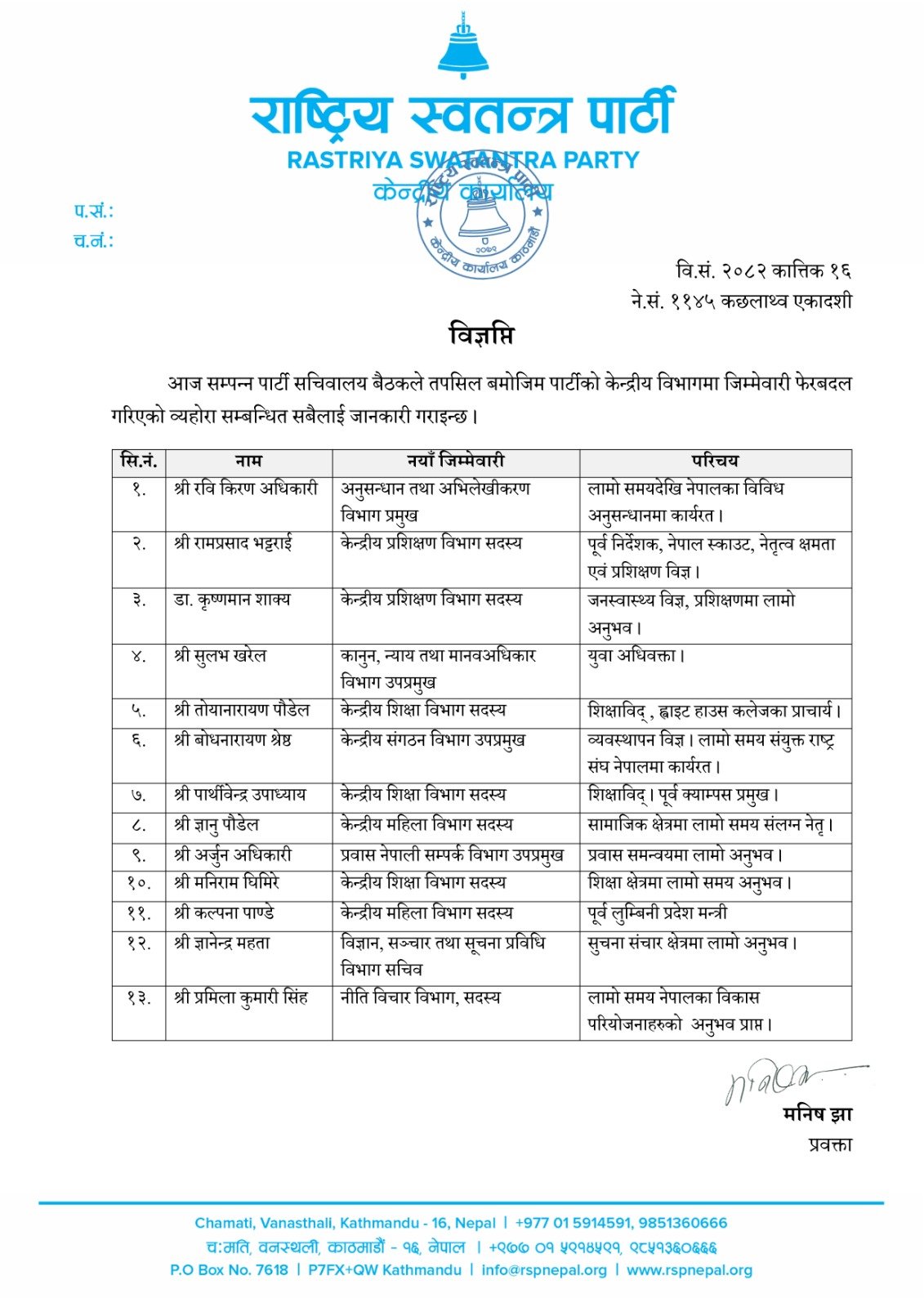 आइतबार बसेको पार्टीको सचिवालय बैठकले विभिन्न विभागका जिम्मेवारी पुनः निर्धारण गरेको रास्वपाका प्रवक्ता मनिष झाले जानकारी दिए ।