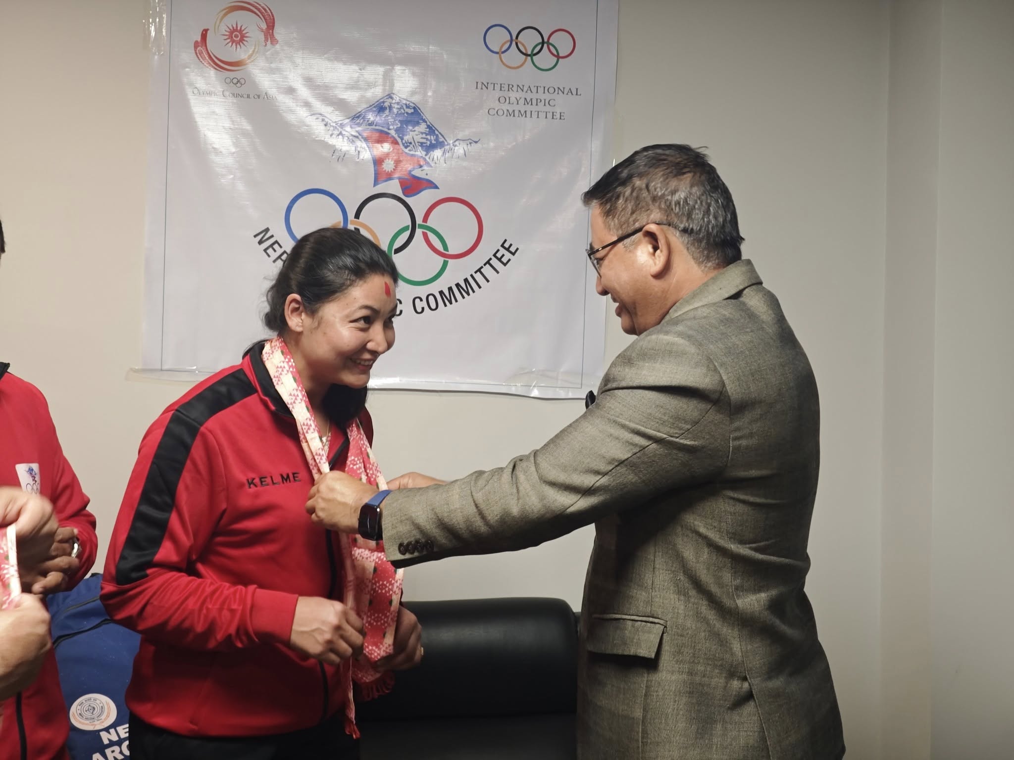 काठमाडौँ। नेपाल ओलम्पिक कमिटी (एनओसी)का अध्यक्ष जीवनराम श्रेष्ठले बुधबार २४ औँ एसियन आर्चरी च्याम्पियन्सीपमा सहभागी हुने नेपाली खेलाडी तथा विश्व आर्चरी कङग्रेसमा सहभागी हुने नेपालका प्रतिनिधिलाई शुभकामनासहित विदाइ गरेका छन् ।