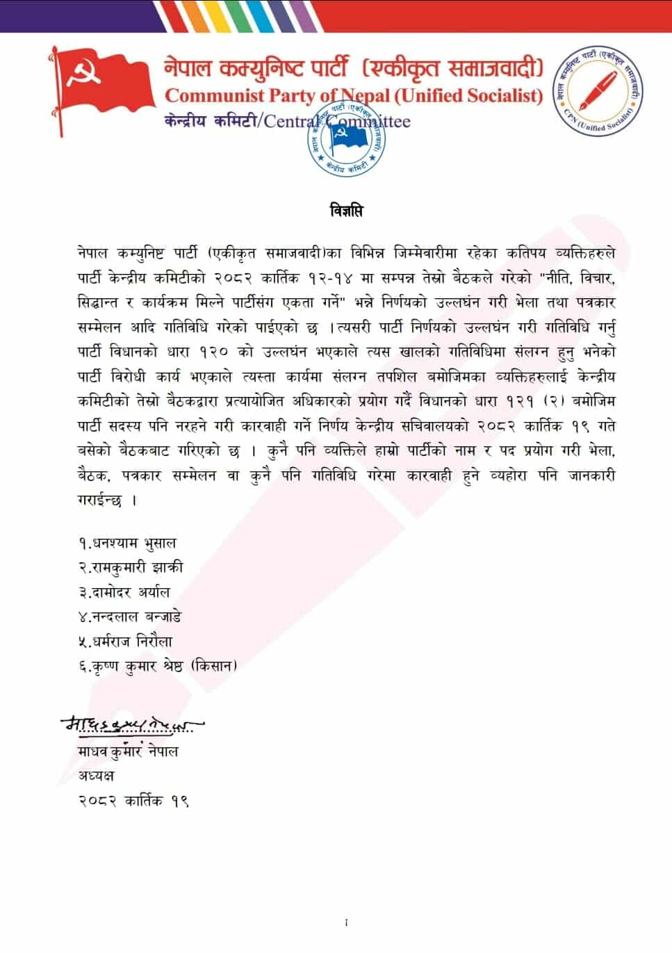 पार्टीको नाम र पदको दुरुपयोग गर्दै कुनै पनि गतिविधि गरे थप कारबाही गर्ने चेतावनी समेत अध्यक्ष नेपालले दिएका छन्।