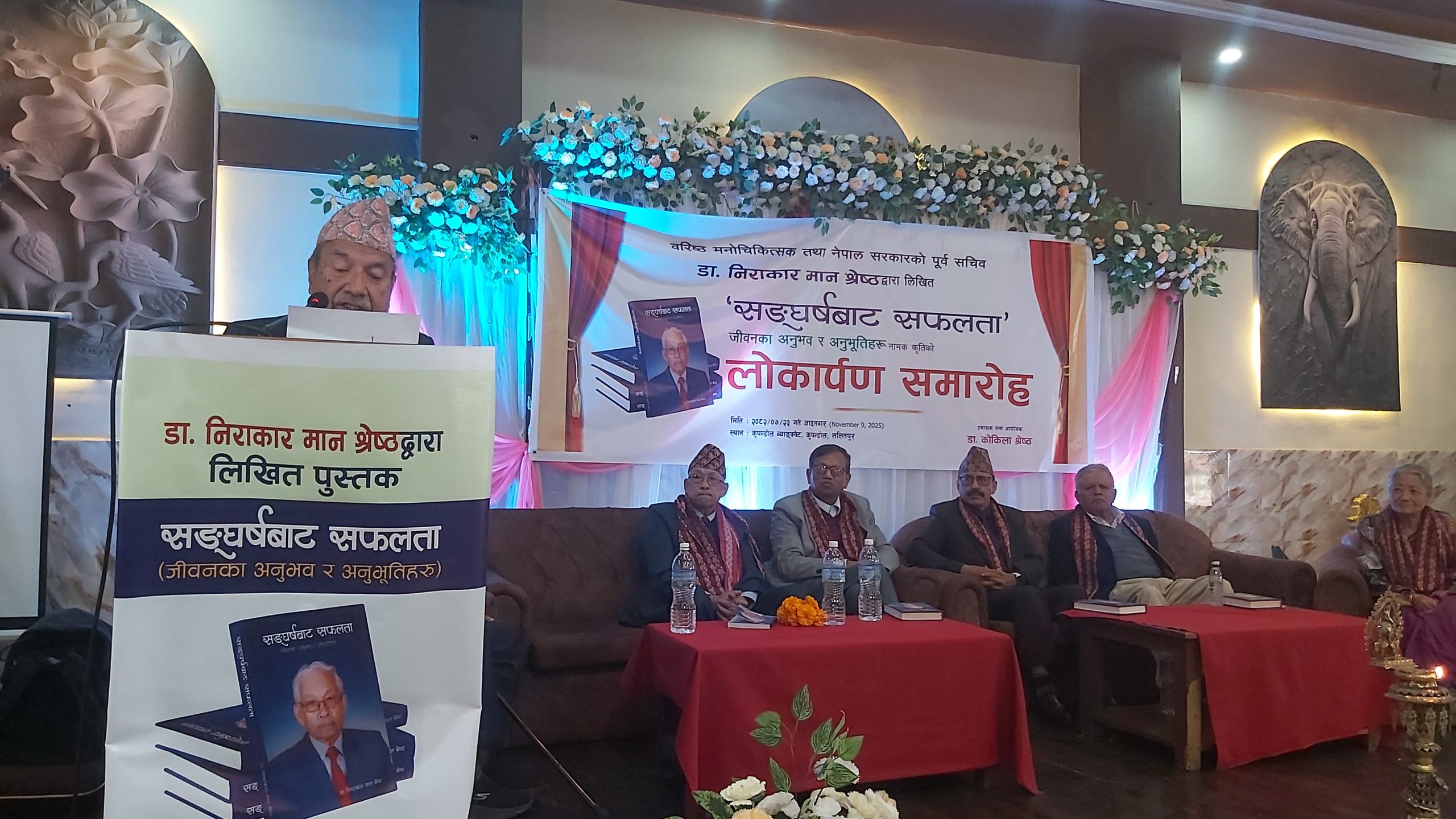 ललितपुर। वरिष्ठ मनोचिकित्सक तथा सरकारका पूर्वसचिव डा निराकारमान श्रेष्ठद्वारा लिखित ‘सङ्घर्षबाट सफलता जीवनका अनुभव र अनुभूतिहरु’ पुस्तक लोकार्पण गरिएको छ ।