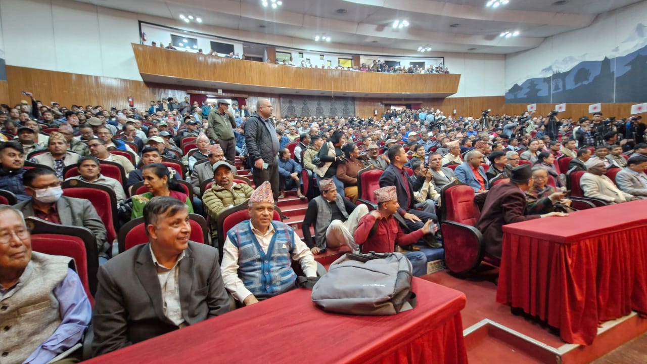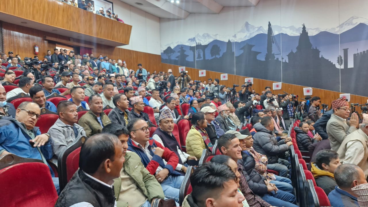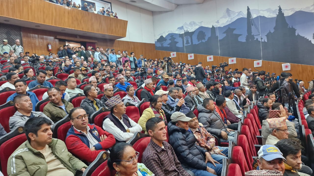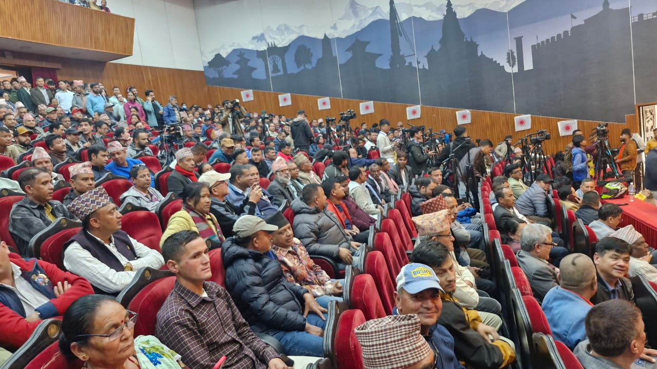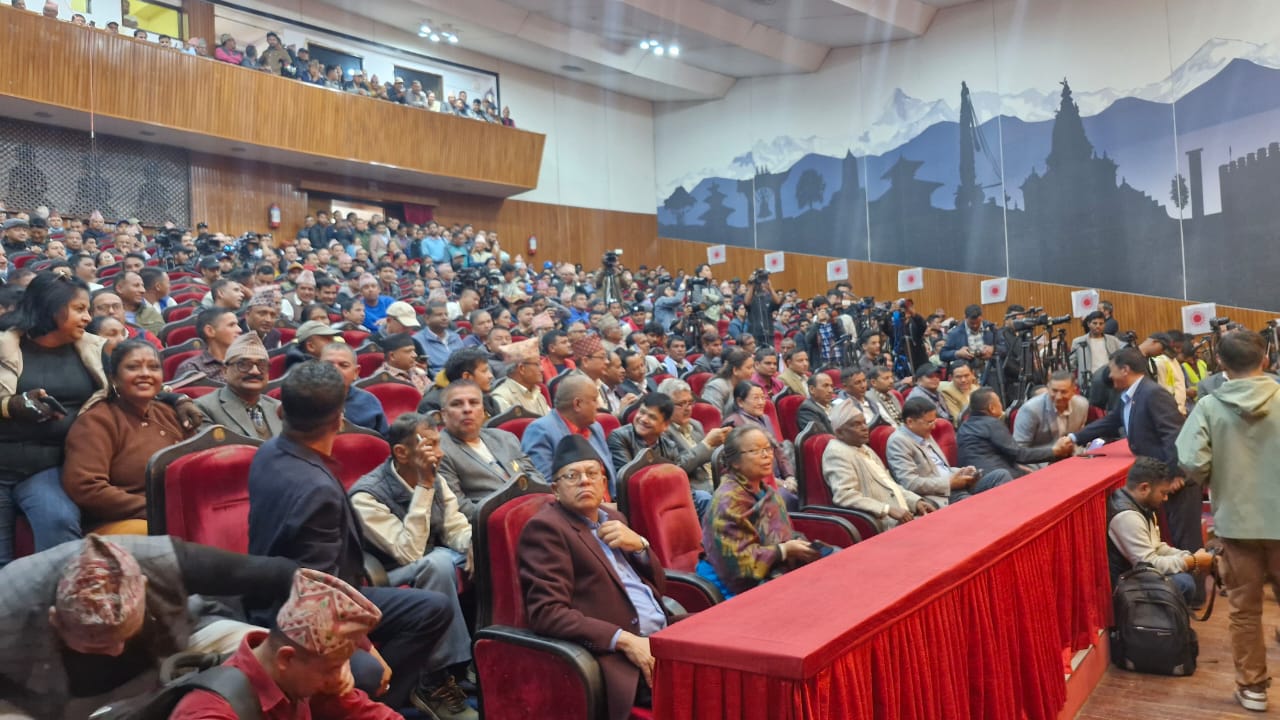 उनीहरूलाई अध्यक्ष केपी शर्मा ओलीले स्वागत गर्दैछन्। राष्ट्रिय सभागृहमा कार्यक्रम जारी छ।