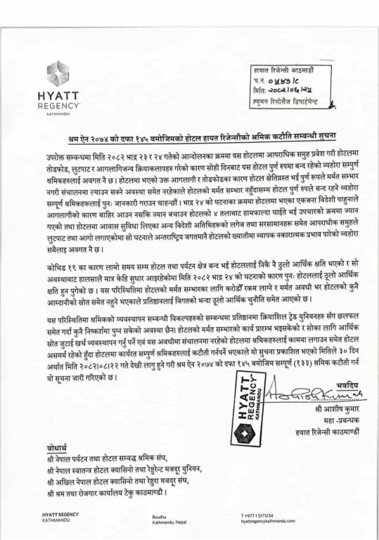 होटलका महाप्रबन्धक आशीष कुमारले मानव संशासधन विभागलाई पत्र लेखेर अहिले होटल बन्द भएको, मर्मतसम्भारका लागि ऋण खोज्नु परेको, कर्मचारी राख्न नसक्ने अवस्था भएको भन्दै सबै कर्मचारी र मजदुर मंसिर २२ गतेभित्र बिदा दिन निर्देशन दिएका छन् ।