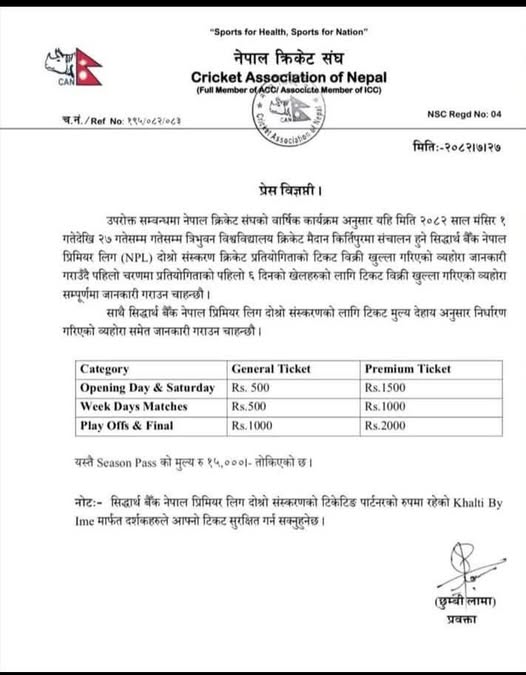 टिकेटहरू एनपीएलको टिकेटिङ पार्टनर खल्ती बाइ आईएमईमार्फत् लिन सकिने क्यानको भनाइ छ।
