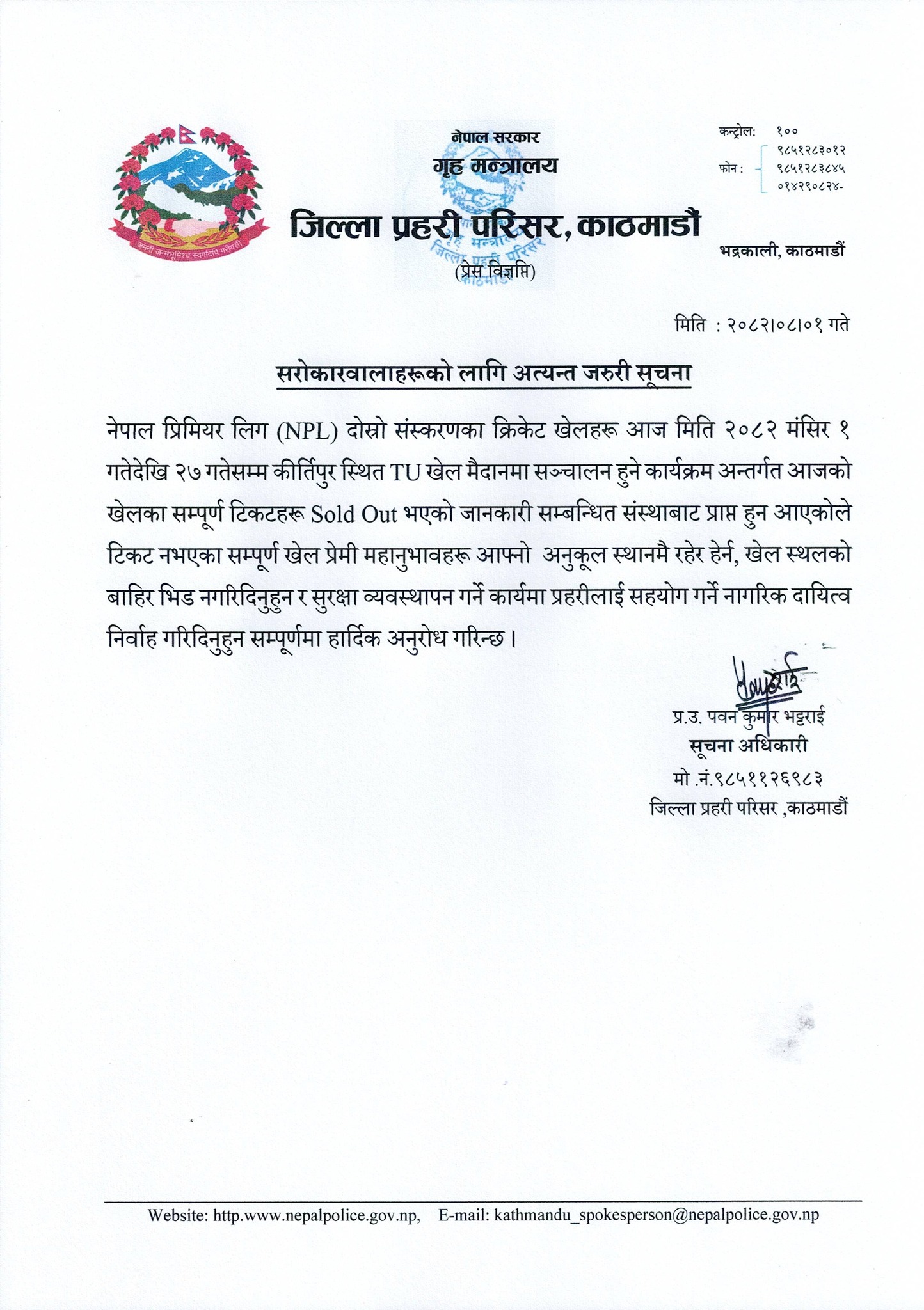 जिल्ला प्रहरी परिसर, काठमाडौंले एक सूचना जारी गर्दै आजबाट सुरु हुने एनपीएल दोस्रो संस्करणको पहिलो दिनको सबै टिकट बिक्री भइसकेकाले टिकट नभएकाहरूलाई खेल स्थलको बाहिर भिडभाड नगर्न अनुरोध गरेको हो ।