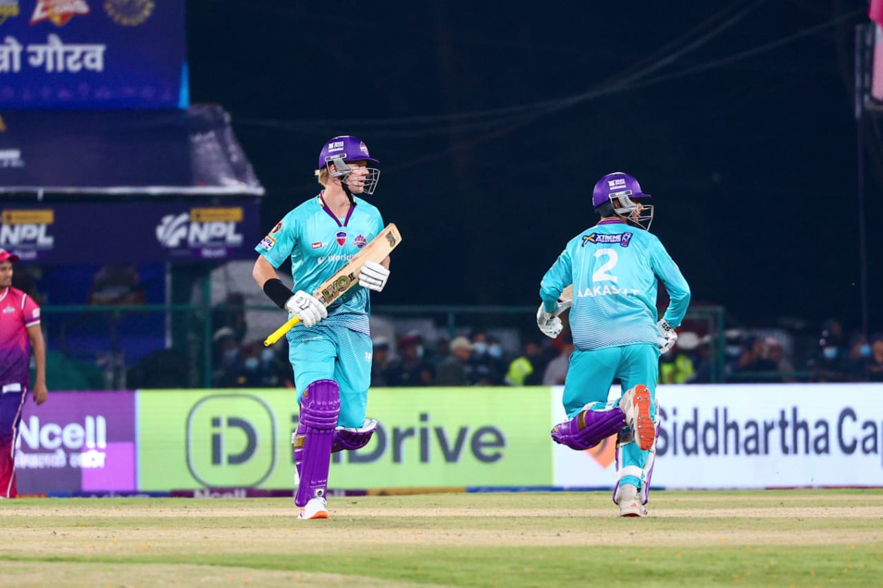 काठमान्डुका लागि बेन चार्ल्सवर्थले २३ बलमा ५ चाैका र ३ छक्काे मद्दतले सर्वाधिक ४६ रनकाे याेगदान गरे । यसैगरी आकाश त्रिपाठीले ३९, मिलिन्ड कुमारले १९ र जाेहन सिम्पसनले १३ रन बनाए ।