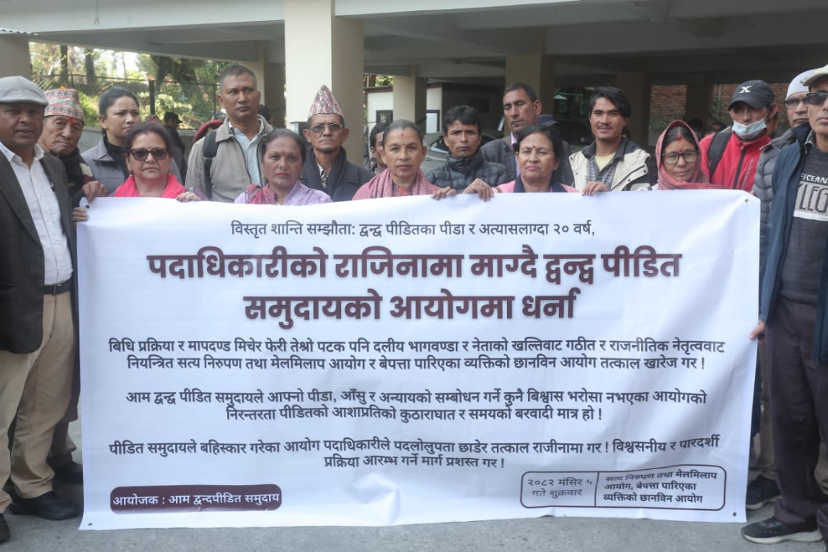 शुक्रवार सत्य निरुपण तथा मेलमिलाप आयोगको कार्यालयमा धर्ना दिएका हुन् ।समुदायले विस्तृत शान्ति सम्झौता भएको २० वर्षगाँठको सन्दर्भमा द्वन्द्वकालमा भएका मानव अधिकार उल्लंघनका घटनाका पीडित समुदायले धर्ना दिएका हुन् ।