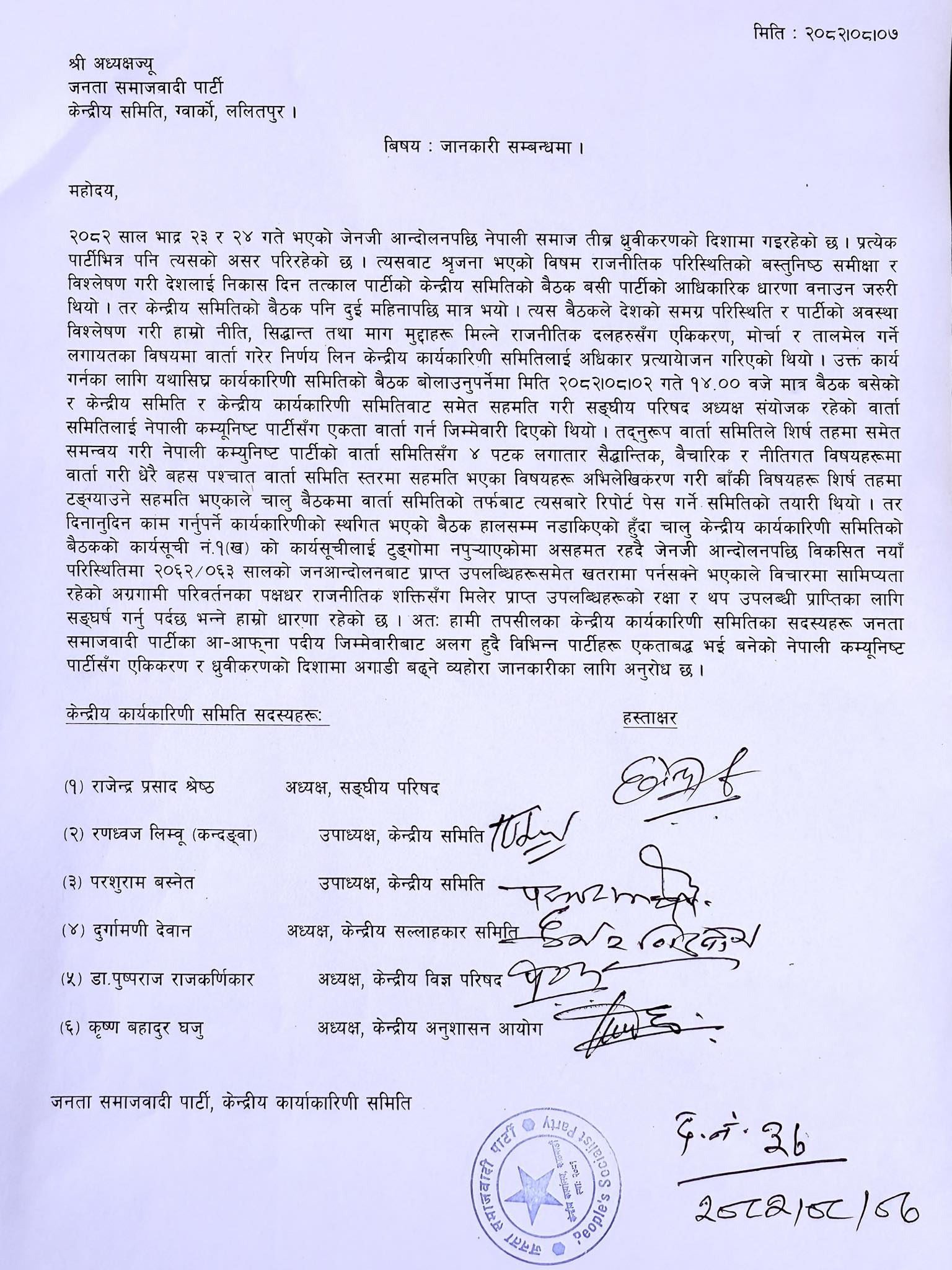 पार्टीका संघीय परिषद् अध्यक्ष राजेन्द्र प्रसाद श्रेष्ठसहित शीर्षस्थ ६ नेताले आफूहरू नेपाली कम्युनिस्ट पार्टी (नेकपा)सँग एकीकरण प्रक्रिया अघि बढाउने घोषणा गरेका छन्।