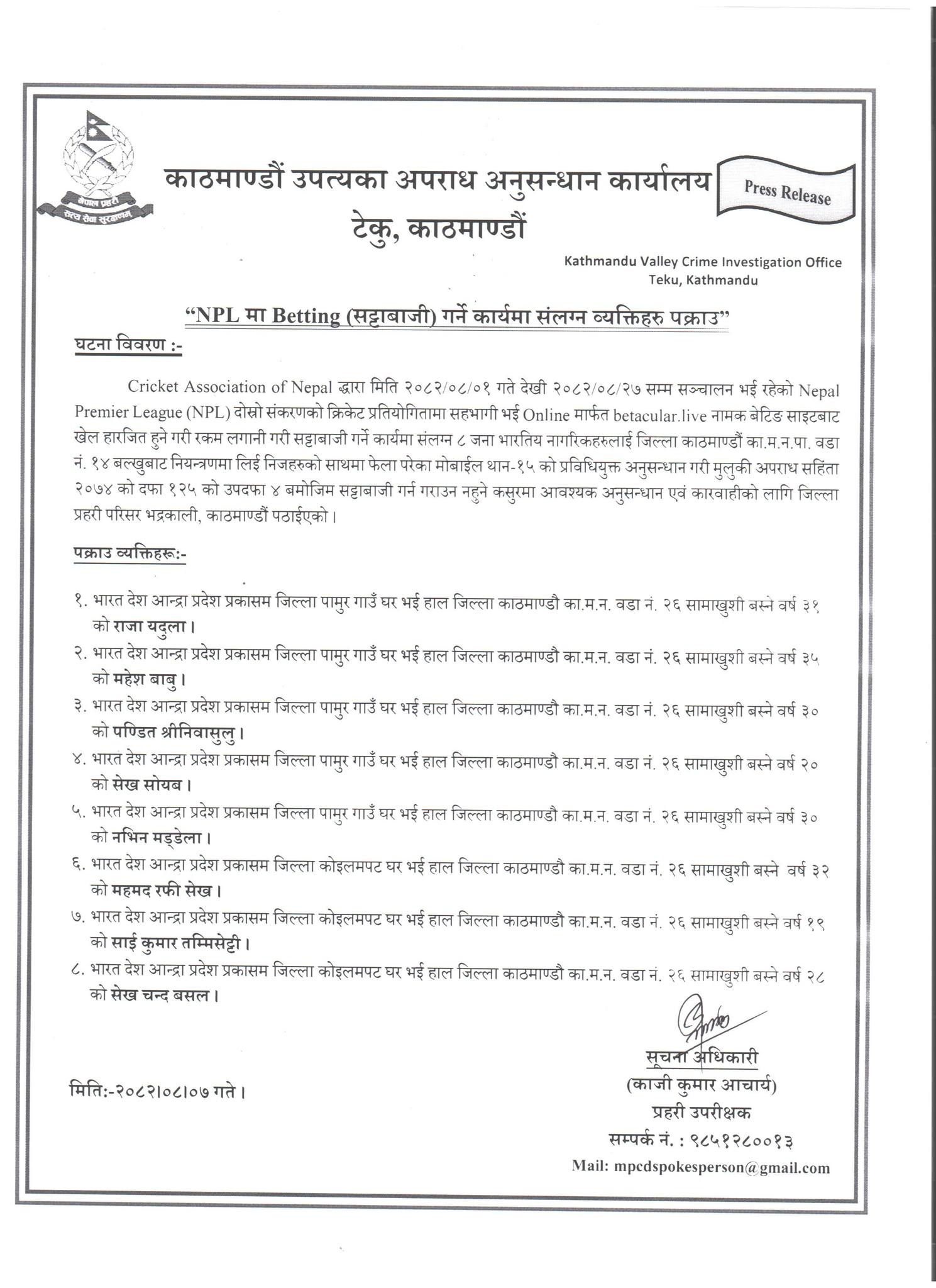 एनपीएलमा सट्टेबाजी गराउने ८ भारतीय पक्राउ
