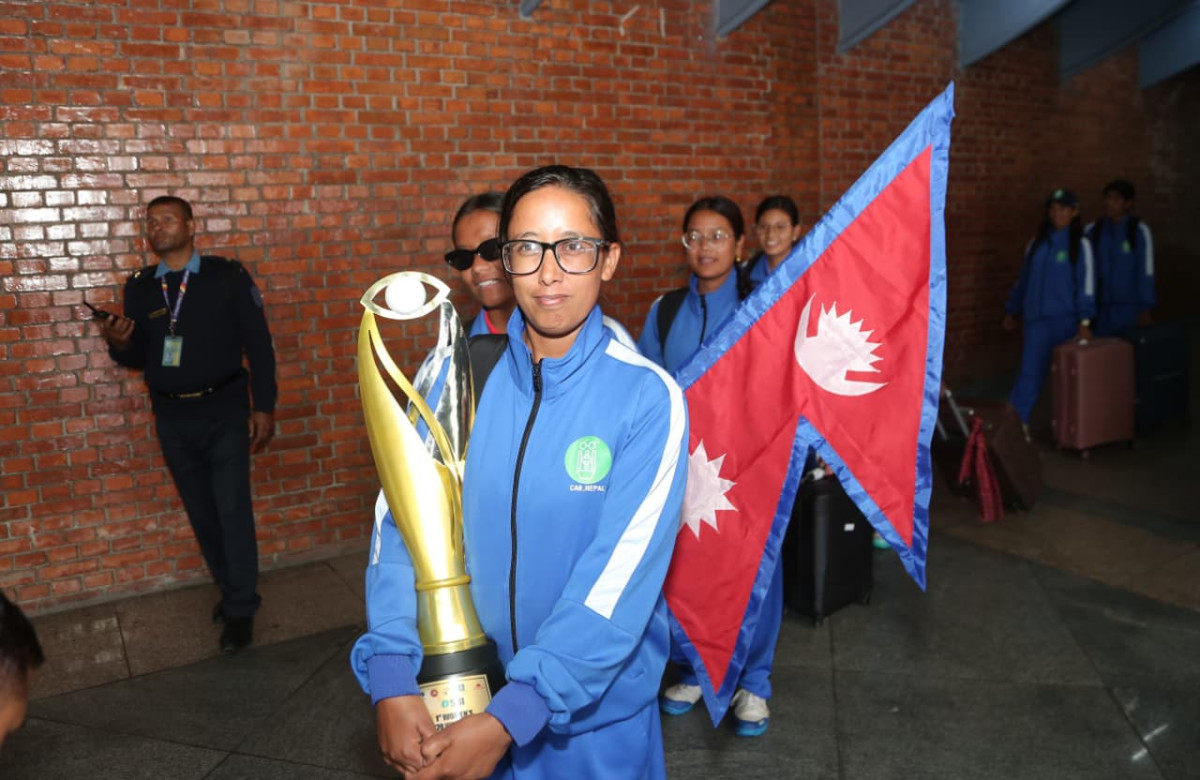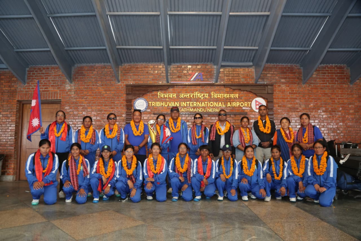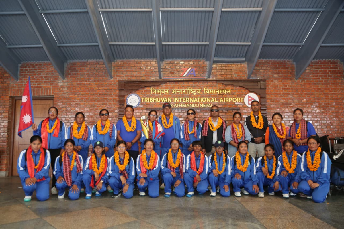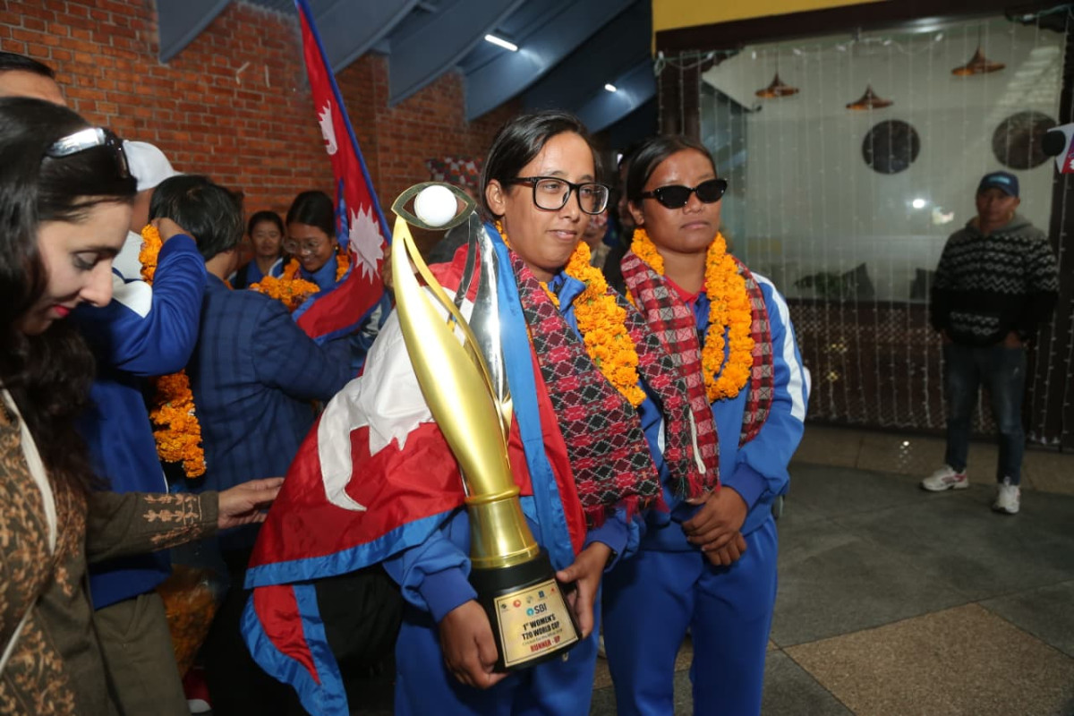 काठमाडौँ ।  श्रीलंका र भारतमा संयुक्त रूपमा आयोजना भएको नेत्रहीन महिला टी ट्वान्टी विश्वकपको पहिलो संस्करणमा उपविजेता बनेको नेपाली महिला टोली स्वदेश फर्किएको छ । टोलीलाई नेपाल क्रिकेट संघ (क्यान) का पदाधिकारीहरुले त्रिभूवन अन्त्र्राष्ट्रिय विमानस्थलमा स्वागत गरे । श्रीलंकाको राजधानी कोलम्बोमा आईतवार सम्पन्न फाइनलमा भारतसँग सात विकेटले पराजित भएको थियो ।