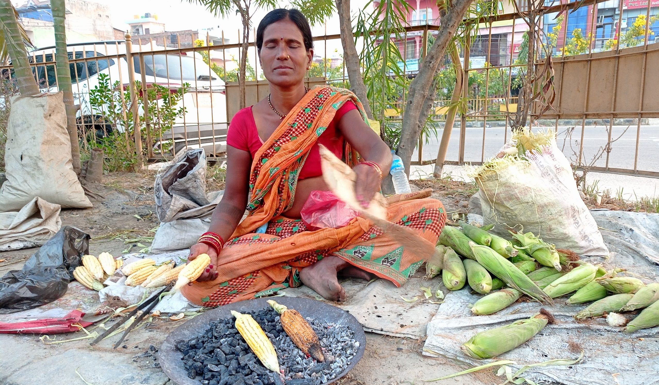 करिब ३०/३५ किलोमिटर धाएर ल्याएको मकै सडकपेटीमै पसारेर हातमुख जोर्ने बन्दोबस्त गर्ने दासलाई त्यसरी आर्जेको एक गाँस खान पनि निकै हतार हुन्छ । “मकै लिन जाँदै एउटा थैलामा खानेकुरा बोकेर हिँड्छु, यहाँ बर्दिबासको सडकपेटीमा मकै बिसाउनासाथ ग्राहक झुम्मिन्छन्, आपूm खानेकुरा खानु कि ग्राहक हेर्नु हुन्छ”, दास भन्नुहुन्छ, “सधैँको राख्ने ठाउँबाट तावा र कोइला निकाल्छु, हतारहतार दुई गाँस खाएर मकै पोल्न थाल्छु ।”