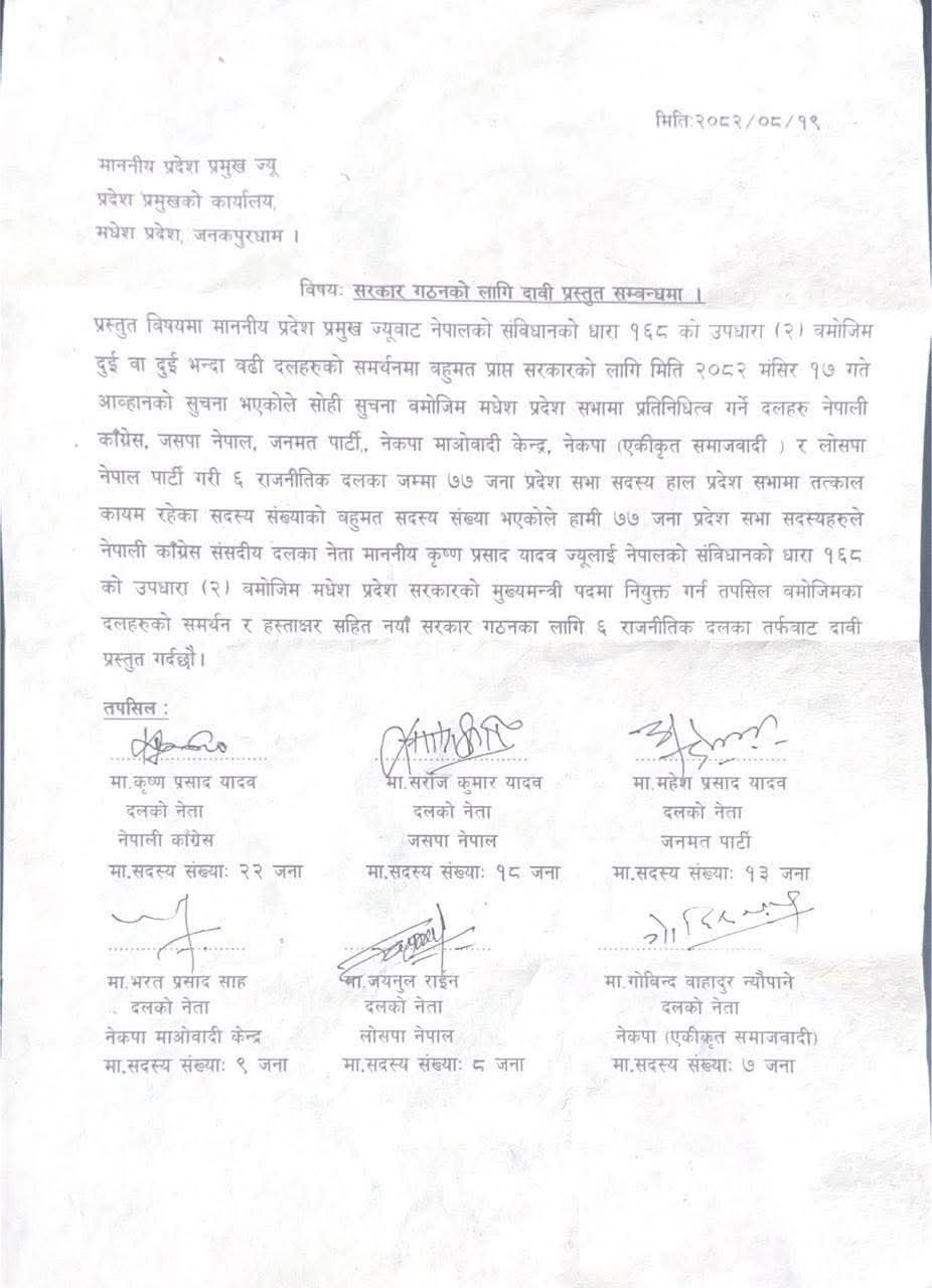 शुक्रबार प्रदेश प्रमुखको कार्यालयमा सात दलका नेतासहित यादवले बहुमत सदस्यहरूको हस्ताक्षरयुक्त दाबीपत्र बुझाएका हुन्।