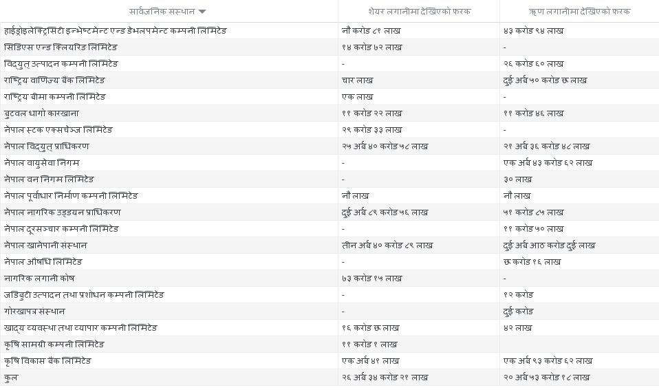 सार्वजनिक ऋण व्यवस्थापन कार्यालयका अनुसार विभिन्न संस्थानमा शेयरतर्फ रू २६ अर्ब ३४ करोड २१ लाख र ऋणतर्फ रू २० अर्ब ५३ करोड १८ लाख गरी कुल रू ४६ अर्ब ८७ करोड ३९ लाख सरकारी बराबर लगानीको हिसाब मिल्न सकेको छैन । सरकारले धेरै लगानी गरेको भन्छ, तर संस्थानहरुले कम भन्छन् । दशकौं अघिदेखिको हिसाबी गडबडीबारे जिम्मेवार को हो ? भन्ने प्रश्न पनि अनुत्तरित छ ।