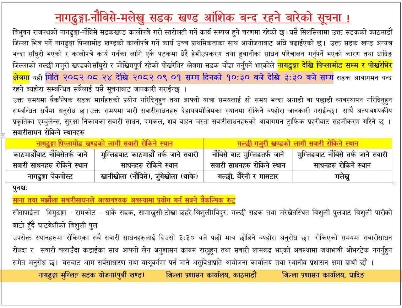सूचना अनुसार नागढुङ्गा देखि पिप्लामोडसम्म र पोखरेभिर क्षेत्रमा यही मङ्सिर २४ गतेदेखि आगामी पुस १ गतेसम्म बिहान १०ः३० बजेदेखि अपराह्न ३ः३० बजेसम्म सडक आवागमन बन्द हुनेछ । सो समयमा वैकल्पिक सडक प्रयोग गरिदिन तथा आफ्नो यात्रा समयलाई सो समय भन्दा अगाडी वा पछाडी व्यवस्थापन गर्न सूचनामा आग्रह गरिएको छ ।