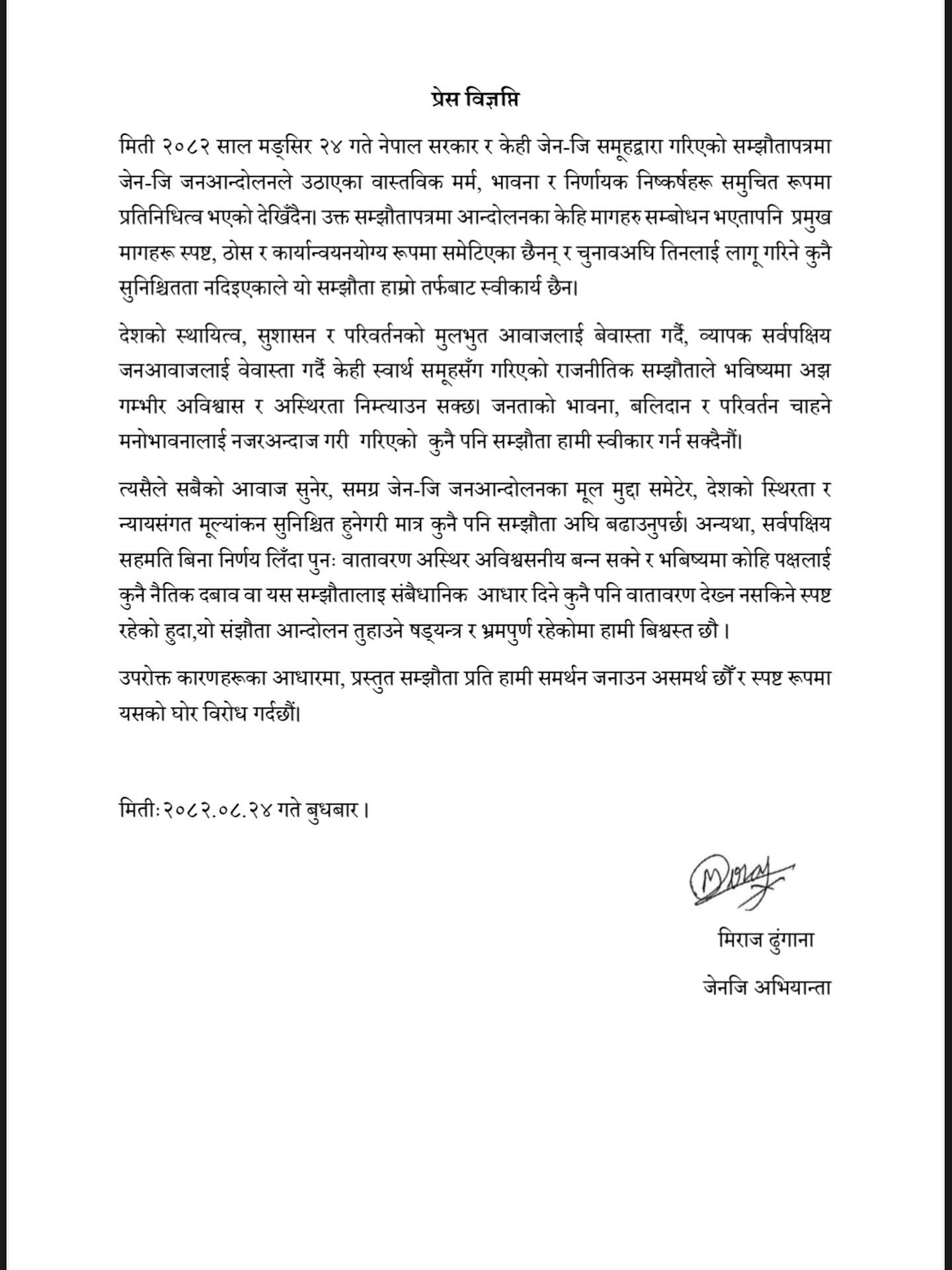 काठमाडौं: नेपाल सरकार र केही जेन–जी समूहबीच भएको सम्झौताप्रति जेन–जी जनआन्दोलनका एक अभियन्ता मिराज ढुगाना समुहले अस्वीकार गरेको छ ।