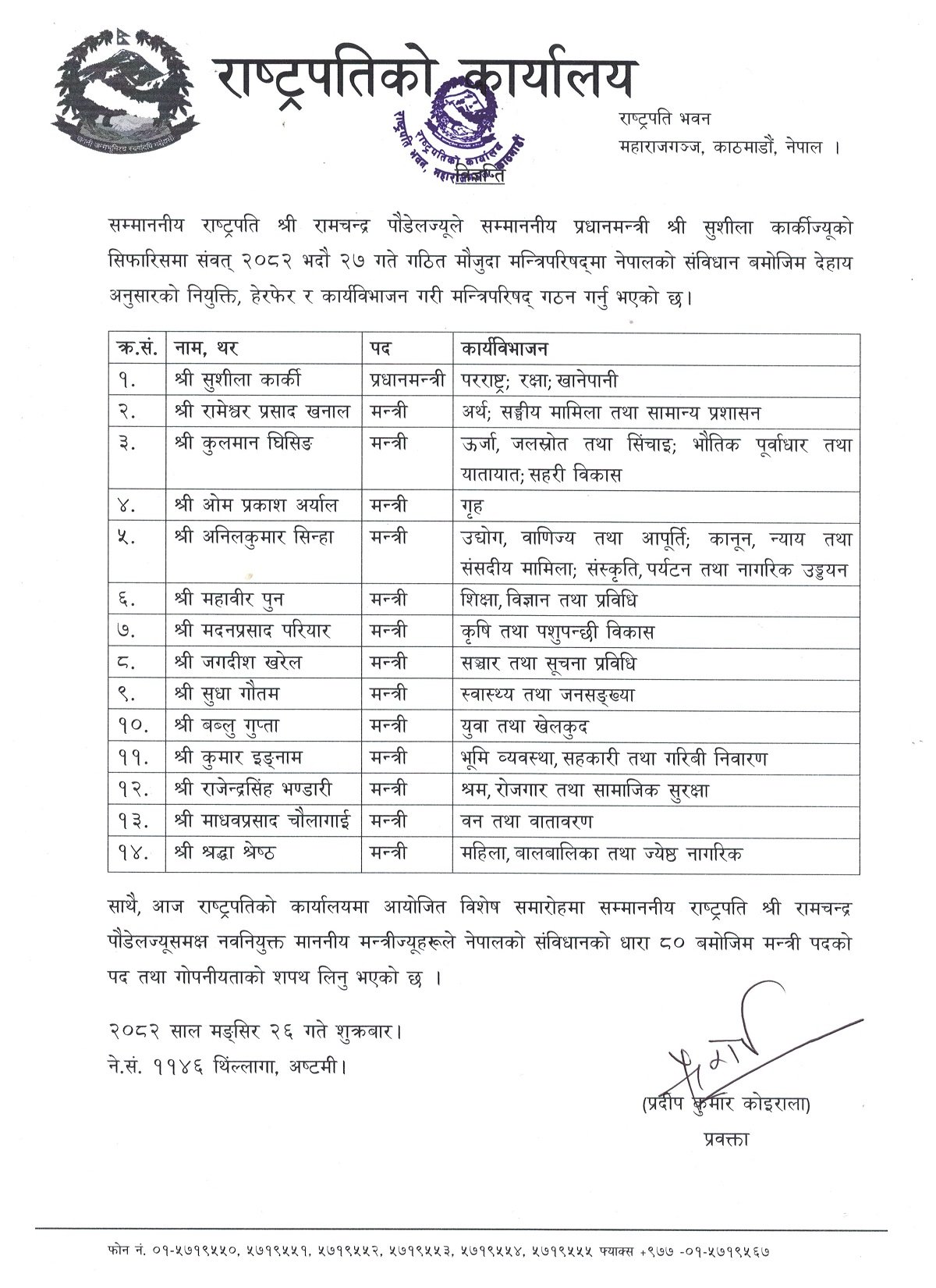 यस्तो बन्यो कार्की नेतृत्वको १४ सदस्यीय मन्त्रिपरिषद् (सूचीसहित)